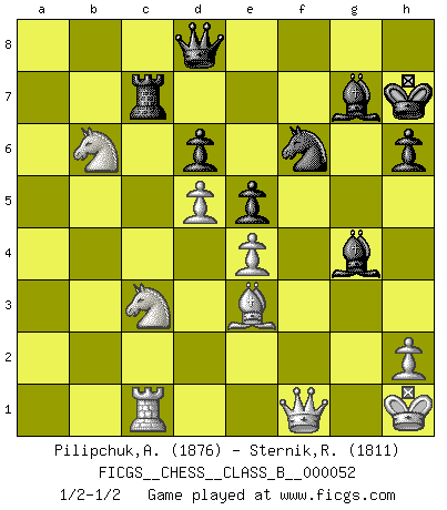 Last move : 1/2-1/2 2008 October 3 20:26:50 [Event "FICGS__CHESS__CLASS_B__000052"] [Site "FICGS"] [Date "2008.08.14"] [Round "1"] [White "Pilipchuk,Andrey"] [Black "Sternik,Ryszard"] [Result "1/2-1/2"] [WhiteElo "1876"] [BlackElo "1811"] 1.d4 Nf6 2.c4 g6 3.Nc3 Bg7 4.e4 d6 5.Nf3 O-O 6.Be2 e5 7.O-O Nc6 8.d5 Ne7 9.Ne1 Nd7 10.Nd3 f5 11.Bd2 Kh8 12.f3 c6 13.b4 cxd5 14.cxd5 Qb6+ 15.Kh1 Nf6 16.Rc1 Bd7 17.Qe1 Rfc8 18.Bg5 h6 19.Bh4 a6 20.a4 Qd8 21.a5 b6 22.axb6 Qxb6 23.Qd2 Kh7 24.Rc2 a5 25.bxa5 Qxa5 26.Rfc1 g5 27.Bf2 g4 28.Ra2 Qd8 29.Rxa8 Rxa8 30.Nb2 gxf3 31.gxf3 fxe4 32.fxe4 Ng6 33.Nc4 Nf4 34.Be3 Nxe2 35.Qxe2 Bg4 36.Qf1 Rc8 37.Nb6 Rc7 1/2-1/2 King's Indian : Orthodox, Aronin-Taimanov variation (Yugoslav attack / Mar del Plata variation) Kingside Castling by player Black (move 5) Kingside Castling by player White (move 7) This chess game ended in a draw. Follow this game move after move (download)Chess teaches you to control the initial excitement you feel when you see something that looks good and it trains you to think objectively when you're in trouble. (Stanley Kubrick) Ohne ihre Erfolge schmälern zu wollen würde ich sagen Petrosian, Spassky und Karpov verdanken ihre Siege ihren Trainern - Boleslavsky, Bondarevsky und Furman. (Mikhail Moiseyevich Botvinik) Solo el jugador con la iniciativa tiene el derecho a atacar. (Wilhelm Steinitz) La menace est plus forte que l'exécution. (Aaron Nimzovitch) When you stop learning you start dying. (M. Scott Adams)