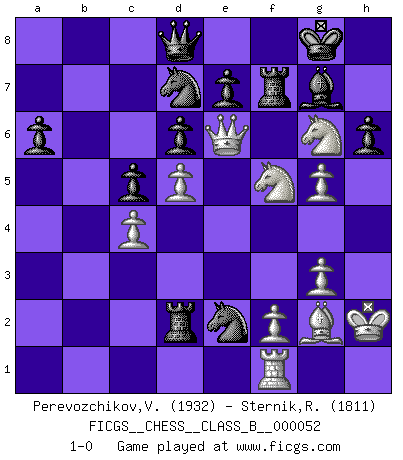 Last move : 1-0 2008 August 21 13:59:21 [Event "FICGS__CHESS__CLASS_B__000052"] [Site "FICGS"] [Date "2008.08.14"] [Round "1"] [White "Perevozchikov,Vjacheslav"] [Black "Sternik,Ryszard"] [Result "1-0"] [WhiteElo "1932"] [BlackElo "1811"] 1.d4 Nf6 2.c4 g6 3.Nc3 Bg7 4.Nf3 O-O 5.g3 d6 6.Bg2 Nc6 7.O-O a6 8.d5 Na5 9.Qd3 c5 10.Bd2 Rb8 11.b3 b5 12.Rac1 h6 13.e4 Bd7 14.e5 bxc4 15.bxc4 Bf5 16.Qe2 Nd7 17.e6 fxe6 18.Nd1 g5 19.Ne3 Bg6 20.h4 Rb2 21.hxg5 Rxa2 22.Nh4 Nb3 23.Nxg6 Rxd2 24.Qg4 Nxc1 25.Qxe6+ Rf7 26.Nf5 Ne2+ 27.Kh2 1-0 King's Indian defense, 3.Nc3 Kingside Castling by player Black (move 4) Kingside Castling by player White (move 7) Player White won this chess game. Follow this game move after move (download)Whoever sees no other aim in the game than that of giving checkmate to one's opponent will never become a good Chess player. (Euwe) Wenn ich Weiß habe gewinne ich weil ich Weiß habe, wenn ich Schwarz habe gewinne ich weil ich Bogoljubov bin. (Efim Bogoljubov) Yo no le temo a Spassky. Todos saben que yo soy el mejor. Uno no necesita un torneo para probarlo. (Bobby Fischer) Echiquier : carré parfait, comme la Jérusalem nouvelle décrite par l'auteur de l'Apocalypse, huit cases sur huit, exaltation du chiffre 4, symbole du cosmos aux quatre horizons... où le noir et le blanc, l'ombre et la lumière, le mal et le bien s'entremêlent et se conjuguent. (Robert Couffignal, Le Gambit du poète) Inventor: A person who makes an ingenious arrangement of wheels, levers and springs, and believes it civilization. (Ambrose Bierce, The Devil's Dictionary)