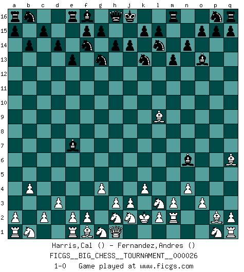 Last move : 1-0 2008 October 7 2:7:26 [Event "FICGS__BIG_CHESS__TOURNAMENT__000026"] [Site "FICGS"] [Date "2008.08.16"] [Round "1"] [White "Harris,Cal"] [Black "Fernandez,Andres"] [Result "1-0"] [WhiteElo ""] [BlackElo ""] 1.m2-m3 m15-m13 2.g2-g4 k16-l14 3.b2-b4 g16-f14 4.p2-p4 b15-b14 5.k2-k4 l16-o13 6.n2-n4 d15-d14 7.d2-d3 j15-k13 8.l1-q6 c16-p4 9.m1-m2 h15-g13 10.o1-p2 n15-n14 11.o2-o3 p4-n6 12.k1-l3 e15-e13 13.c1-l9 o16-e7 14.j1-k2 1-0 Follow this game move after move (download)Chess is a part of culture and if a culture is declining then Chess too will decline. (Mikhail Botvinnik) Bis jetzt ist Weiß einer wohlbekannten Analyse gefolgt. Aber jetzt begeht er einen schrecklichen Fehler: Er beginnt seinen eigenen Kopf zu benutzen. (Siegbert Tarrasch) Al jugar al Ajedrez entonces, podemos aprender: Primero: Previsión... Segundo: Prudencia... Tercero: Cautela... Y al final, aprendemos del Ajedrez el hábito de no ser desanimados por apariencias malas presentes en el estado de nuestros asuntos, el hábito de la esperanza por una oportunidad favorable y la perseveración de los secretos de los recursos. (Benjamin Franklin) L'attaque fait le spectacle, la défense gagne les matchs. (Dicton footballistique) I've lost money so fast in these clubs it's left me reeling. I've read every poker book ever written, but the only way to get better at the game is to go out and play with people who are really good. The problem is, you stand to lose a lot of money doing it. (Matt Damon)