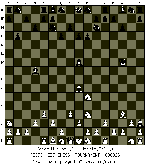 Last move : 1-0 2008 October 18 12:12:18 [Event "FICGS__BIG_CHESS__TOURNAMENT__000026"] [Site "FICGS"] [Date "2008.08.16"] [Round "1"] [White "Jerez,Miriam"] [Black "Harris,Cal"] [Result "1-0"] [WhiteElo ""] [BlackElo ""] 1.m2-m3 k15-k13 2.e2-e4 g15-g13 3.d2-d3 p15-p13 4.c1-p13 o15-o14 5.p13-j7 b15-b13 6.j2-k4 j15-l14 7.b1-a3 h15-f14 8.l1-o4 d15-d14 9.f2-f3 h16-o10 10.h3-h4 j14-j13 11.p2-p3 c16-l8 12.h2-j4 l16-d9 13.j4-k6 l8-j10 14.o1-q3 1-0 This big chess game has been lost on time (started : 2008.08.16 2:42:46) Follow this game move after move (download)Do you realize Fischer almost never has any bad pieces? He exchanges them, and the bad pieces remain with his opponents. (Yuri Balashov) Das Schach ist nichts für kleine Geister, es beansprucht einen vollen Mann, der sich nicht sklavisch an das Überlieferte hält, sondern selbständig die Tiefen des Spiels zu ergründen sucht. (Wilhelm Steinitz) Evita las multitudes. Haz independientemente tu propio razonamiento. Trata de ser el jugador de Ajedrez, no la pieza de Ajedrez. (Ralph Charell) Celui qui prend des risques peut perdre, celui qui n'en prend pas perd toujours. (Xavier Tartacover) Beta. Software undergoes beta testing shortly before it's released. Beta is latin for still doesn't work. (Anonymous)