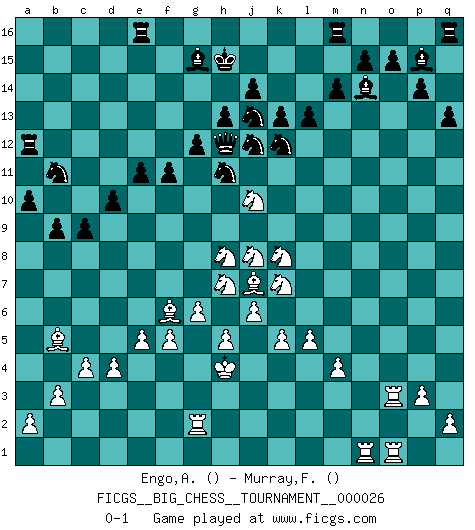 Last move : 0-1 2009 January 20 19:26:20 [Event "FICGS__BIG_CHESS__TOURNAMENT__000026"] [Site "FICGS"] [Date "2008.08.16"] [Round "1"] [White "Engo,Arne Sigvald"] [Black "Murray,Findlay"] [Result "0-1"] [WhiteElo ""] [BlackElo ""] 1.f2-f4 j15-k13 2.l2-l4 c15-c13 3.g2-g4 h16-o10 4.j2-h4 o10-o2 5.k2-k4 d15-d13 6.h1-k3 b16-c14 7.e2-e3 p15-p14 8.c2-c3 o16-p15 9.k3-f7 f15-f13 10.k1-l3 m15-m14 11.g1-f3 l16-n14 12.f7-c7 e15-e13 13.n2-n3 o2-o10 14.d2-d4 b15-b13 15.p1-o3 a15-a13 16.m2-m4 c13-c12 17.j3-j4 b13-b12 18.e3-e4 b12-b11 19.j4-j5 a13-a12 20.f4-f5 c16-e14 21.f1-b5 g16-j15 22.l4-l5 p16-o14 23.c1-j7 c14-a13 24.b1-d2 d13-d12 25.h4-j6 c12-c11 26.e4-e5 a12-a11 27.l1-f6 g15-g13 28.j6-h8 e13-e12 29.d2-e4 f16-g15 30.h2-j4 d12-d11 31.h3-h4 o10-n10 32.e1-g1 n10-n3 33.j1-k2 k16-m15 34.m1-m3 n3-o4 35.f3-g5 a11-a10 36.p2-p3 o4-l7 37.l3-k5 l7-d14 38.o1-p2 b11-b10 39.o3-n5 a13-b11 40.g5-f7 h15-j13 41.h4-h5 j16-h15 42.e4-g5 c11-c10 43.k5-h6 c10-c9 44.k2-j3 d11-d10 45.g1-g2 e14-d13 46.k4-k5 e12-e11 47.p2-g10 f13-f12 48.g10-d13 d14-d13 49.b2-b3 f12-f11 50.j5-j6 a16-a12 51.g5-h7 g13-g12 52.j3-h4 o14-m13 53.g4-g5 l15-l13 54.n5-m7 m15-k14 55.g5-g6 h14-h13 56.m7-k8 b10-b9 57.j4-k6 j15-g14 58.q1-o1 k13-h12 59.m3-o3 m13-k12 60.f7-g9 k14-j12 61.h6-k7 k15-k13 62.a1-n1 q15-q13 63.c3-c4 j13-h11 64.k6-j8 g14-j13 65.c7-h12 d13-g13 66.g9-j10 g13-h12 0-1 This big chess game has been lost on time (started : 2008.08.16 2:42:46) Follow this game move after move (download)Chess is a fighting game which is purely intellectual and includes chance. (Richard Reti) Im Leben werden Partien nie so unstrittig gewonnen wie im Spiel (Emanuel Lasker) No existe un remordimiento como el remordimiento del Ajedrez. (H. G. Wells) Le système Elo représente seulement une moyenne. Il est simplement un indicateur de votre stabilité. (Anatoli Karpov) The weakness of an artist is dogma. (Josh Waitzkin)