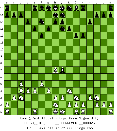 Last move : 0-1 2008 October 11 18:24:16 [Event "FICGS__BIG_CHESS__TOURNAMENT__000026"] [Site "FICGS"] [Date "2008.08.16"] [Round "1"] [White "Konig,Paul"] [Black "Engo,Arne Sigvald"] [Result "0-1"] [WhiteElo "1357"] [BlackElo ""] 1.g2-g4 n15-n14 2.f2-f4 d15-d14 3.e2-e4 o16-g9 4.n2-n3 m15-m13 5.d2-d4 e15-e13 6.c2-c4 c16-k9 7.b2-b3 k15-k13 8.c4-c5 g15-g13 9.g1-f3 l15-l13 10.b1-c3 b16-d15 11.f4-f5 f15-f13 12.f1-c4 l13-l12 13.c1-n11 p16-n15 14.p1-o3 f13-f12 15.f3-g5 n15-l14 16.g5-h7 k9-h7 17.o1-h7 d15-f14 18.j2-k4 l14-j13 19.k1-l3 m13-m12 20.n11-j7 g9-j7 0-1 Follow this game move after move (download)I have never in my life played the French Defence, which is the dullest of all openings. (Wilhelm Steinitz) Es genügt nicht ein guter Spieler zu sein, man muß auch gut spielen. (Siegbert Tarrasch) Buenas posiciones no logran ganar juegos, buenas movidas sí. (Gerald Abrahams) On entre au jeu d'Echecs comme on entre en Religion. Pour le joueur d'Echecs, la partie d'Echecs c'est l'office, la messe, le défilé du 1er Mai, le dépôt de gerbe au Monument aux Morts. C'est un drame sacré. (Michel Roos) Memory is a crazy woman that hoards colored rags and throws away food. (Austin O'Malley)