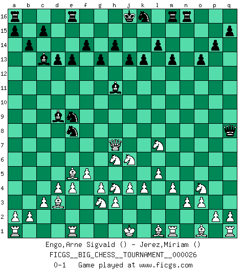 Last move : 0-1 2009 January 7 5:40:15 [Event "FICGS__BIG_CHESS__TOURNAMENT__000026"] [Site "FICGS"] [Date "2008.08.16"] [Round "1"] [White "Engo,Arne Sigvald"] [Black "Jerez,Miriam"] [Result "0-1"] [WhiteElo ""] [BlackElo ""] 1.g1-f3 h15-g13 2.k1-l3 b16-c14 3.g2-g4 d15-d13 4.k2-k4 g13-h11 5.j2-g3 p15-p14 6.f3-h4 p16-o14 7.f2-f4 k15-k13 8.h2-j4 h11-g9 9.h1-q9 l16-k15 10.q9-g9 n15-n14 11.g9-j9 o16-p15 12.f4-f5 e15-e13 13.c2-c3 f16-c13 14.n2-n3 o14-n12 15.j9-p15 o15-o13 16.l3-k5 l15-l14 17.p15-f6 f15-f14 18.f6-n13 g15-g13 19.e2-e4 m15-m14 20.n13-n14 q16-n16 21.n14-k11 c16-p4 22.o2-o3 n12-m10 23.k11-l10 p4-k9 24.l10-m10 m14-m13 25.m10-m5 g16-e15 26.k5-l7 k9-h11 27.l2-l4 j15-h13 28.l4-l5 h16-q8 29.m2-m4 e15-f13 30.p1-n2 c14-b12 31.n2-o4 f13-e11 32.d2-d4 e11-f9 33.c1-f4 b15-b14 34.b1-d2 f9-g7 35.f4-e5 g7-e8 36.f1-d3 j14-j13 37.d2-f3 h13-j11 38.j4-h6 k15-d9 39.j3-j4 j11-h9 40.m5-h9 e8-f10 41.h9-h7 b12-c10 42.f3-g5 c10-e9 43.g5-j6 f10-e8 0-1 This big chess game has been lost on time (started : 2008.08.16 2:42:46) Follow this game move after move (download)We cannot resist the fascination of sacrifice, since a passion for sacrifices is part of a Chessplayer's nature. (Rudolf Spielman) Je mehr ich von der FIDE weiss, um so weniger verstehe ich. (Alexander Kalifman) Los finales de Peón son del Ajedrez lo que el cesped es del Golf. (Cecil Purdy) Toute estimation doit être constamment réévaluée. (Jacob Estrin) Without enthusiasm, virtue functions not at all, and vice only poorly. (Mignon McLaughlin, The Neurotic's Notebook, 1960)