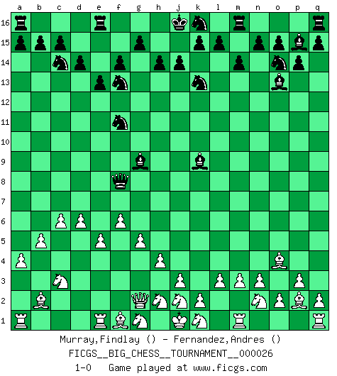 Last move : 1-0 2008 September 30 1:40:40 [Event "FICGS__BIG_CHESS__TOURNAMENT__000026"] [Site "FICGS"] [Date "2008.08.16"] [Round "1"] [White "Murray,Findlay"] [Black "Fernandez,Andres"] [Result "1-0"] [WhiteElo ""] [BlackElo ""] 1.c2-c4 e15-e13 2.d2-d4 f15-f14 3.e2-e4 f16-a11 4.b1-c3 m15-m14 5.p2-p3 b16-c14 6.o1-p2 g16-e15 7.m2-m3 l16-q11 8.f2-f4 d15-d14 9.c4-c5 c16-k9 10.b2-b4 p15-p14 11.l1-o4 k9-n6 12.a2-a4 o16-p15 13.e4-e5 a11-c13 14.n2-n3 e15-f13 15.d4-d5 p16-o14 16.b4-b5 h15-g13 17.f4-f5 n6-k9 18.g2-g4 c13-h8 19.f5-f6 j15-k13 20.g4-g5 h16-l13 21.c5-c6 q11-o13 22.l2-l3 l13-c5 23.c1-b2 h8-g9 24.h3-h4 c5-b4 25.h1-g2 b4-f8 26.d5-d6 g13-f11 27.p1-n2 1-0 Follow this game move after move (download)The laws of Chess do not permit a free choice: you have to move whether you like it or not. (Emanuel Lasker) Schach ist ein schwarz-weisser Dschungel. (Garry Kasparov) Solo el jugador con la iniciativa tiene el derecho a atacar. (Wilhelm Steinitz) Les Echecs, c'est l'art de la guerre sans les charniers, c'est la résurrection des morts tombés au champ d'honneur, l'espoir perpétuel, la suprématie de l'intelligence sur la force, la culture de l'esprit. (F. Szpiner) Life is like internet, nothing interesting, but noone want to leave it. (Ilmars Cirulis)