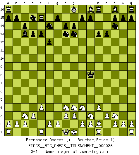 Last move : 0-1 2008 September 25 1:15:44 [Event "FICGS__BIG_CHESS__TOURNAMENT__000026"] [Site "FICGS"] [Date "2008.08.16"] [Round "1"] [White "Fernandez,Andres"] [Black "Boucher,Brice"] [Result "0-1"] [WhiteElo ""] [BlackElo ""] 1.d2-d3 e15-e13 2.e2-e4 d15-d13 3.g1-f3 f16-c13 4.p1-o3 f15-f13 5.n2-n3 f13-f12 6.o1-b13 c15-c14 7.b13-d11 g16-f14 8.d11-g14 e16-e15 9.c1-l9 k16-l14 10.k1-l3 l14-j13 11.g14-l10 j15-h13 12.f1-e2 h16-l13 13.l9-f14 h15-f14 14.f3-h4 l13-l10 15.b1-c3 c16-l8 16.e2-l8 l10-l8 17.j2-k4 n15-n13 18.m2-m4 m15-m13 19.h2-j4 b16-d15 20.l1-m2 p16-o14 0-1 Follow this game move after move (download)My opponents make good moves too. Sometimes I don't take these things into consideration. (Bobby Fischer) Es ist im Leben wie im Schachspiel. Wir entwerfen einen Plan, dieser bleibt jedoch bedingt durch das, was im Schachspiel dem Gegner, im Leben dem Schicksal zu tun belieben wird. (Arthur Schopenhauer) No volvere nunca a jugar contigo. Has insultado a mi amigo. - cuando un oponente se maldijo por una mala jugada (Miguel Najdorf) Je menace de comprendre la position. (Anonyme) In every real man a child is hidden that wants to play. (Friedrich Nietzsche)