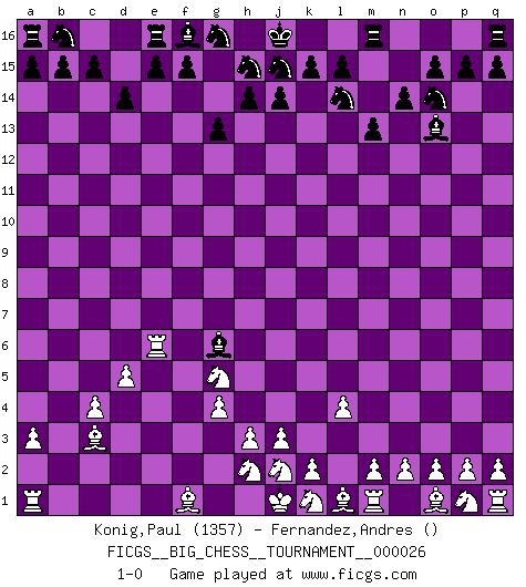 Last move : 1-0 2008 October 2 2:12:39 [Event "FICGS__BIG_CHESS__TOURNAMENT__000026"] [Site "FICGS"] [Date "2008.08.16"] [Round "1"] [White "Konig,Paul"] [Black "Fernandez,Andres"] [Result "1-0"] [WhiteElo "1357"] [BlackElo ""] 1.g2-g4 m15-m13 2.f2-f4 k16-l14 3.e2-e4 p16-o14 4.d2-d4 l16-o13 5.c2-c4 d15-d14 6.b2-b4 c16-k9 7.b1-c3 n15-n14 8.a2-a3 g15-g13 9.d4-d5 h16-a9 10.l2-l4 o16-b4 11.c1-b2 b4-c3 12.b2-c3 a9-f4 13.h1-f3 f4-f3 14.g1-f3 k9-e4 15.f3-g5 e4-g6 16.e1-e6 1-0 Follow this game move after move (download)It is not a move, even the best move that you must seek, but a realizable plan. (Eugene Znosko-Borovsky) Jeder Schachmeister war einmal ein Anfänger. (Irving Chernev) Cuando la partida de Ajedrez termina, el Peón y el Rey regresan a la misma caja. (Irish saying) L'action d'une oeuvre littéraire se déroule sur un champ de bataille. Les masques et les types du drame moderne correspondent aux pièces du jeu d'échecs. L'intrigue correspond aux coups et aux gambits, c'est à dire aux techniques du jeu telles qu'utilisées et interprétées par les joueurs. Les tactiques et les péripéties [mouvements] correspondent aux coups exécutés par l'adversaire. (Viktor Shklovsky) Some people are so afraid to die that they never begin to live. (Henry Van Dyke)