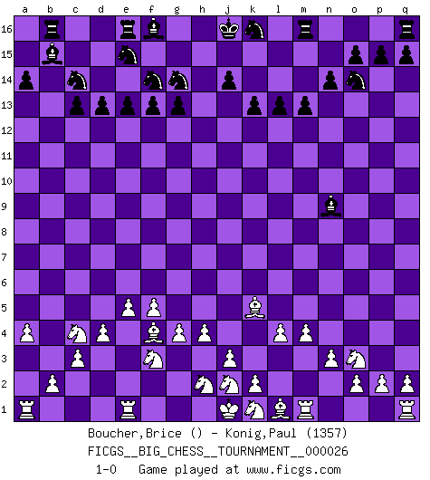 Last move : 1-0 2008 November 22 1:46:24 [Event "FICGS__BIG_CHESS__TOURNAMENT__000026"] [Site "FICGS"] [Date "2008.08.16"] [Round "1"] [White "Boucher,Brice"] [Black "Konig,Paul"] [Result "1-0"] [WhiteElo ""] [BlackElo "1357"] 1.d2-d4 g15-g13 2.e2-e4 f15-f13 3.f1-c4 n15-n14 4.n2-n3 e15-e13 5.m2-m4 d15-d13 6.f2-f4 c15-c13 7.e4-e5 b16-c14 8.g2-g4 b15-b13 9.o1-b13 g16-e15 10.b1-d2 a15-a14 11.b13-g8 h15-f14 12.d2-e4 m15-m13 13.l2-l4 p16-o14 14.p1-o3 o16-b4 15.c2-c3 b4-k12 16.g1-f3 h14-h13 17.f4-f5 k12-n9 18.h3-h4 l15-l13 19.c1-f4 j15-g14 20.a2-a4 h16-k14 21.h1-g2 c16-b15 22.g2-n8 k14-d8 23.g8-k5 d8-c7 24.c4-b5 l16-m15 25.e4-d6 m15-j12 26.b5-j12 h13-j12 27.n8-j12 k15-k13 28.j12-b5 a16-b16 29.b5-c4 c7-c4 30.d6-c4 1-0 Follow this game move after move (download)After a bad opening, there is hope for the middle game. After a bad middle game, there is hope for the endgame. But once you are in the endgame, the moment of truth has arrived. (Edmar Mednis) Der Traum, für den ich lebe, ist der von einem freien Russland. Viele mögen sagen: Russland hat doch ein Parlament, einen gewählten Präsidenten. Aber ich spüre, dass in meiner Heimat die Angst wiederkehrt. Eine Angst, sich frei zu äußern, bestimmte Dinge zu tun (Garry Kasparov) El jugador táctico sabe que hacer cuando hay algo que hacer; mientras que el estratega sabe que hacer cuando no hay nada que hacer. (Gerald Abrahams) Les erreurs sont comme les malheurs, elles n'arrivent jamais seules. (Siegbert Tarrasch) Methinks King Thibault should dub Marius Zubac a knight of the square board... I mean table, henceforth addressing him as Sir Marius, and bestow on him a suitable land from the kingdom of FICGS & marry him off to a worthy, fair maiden, lest he slice our heads with his mighty sword in his wrath. (Dinesh De Silva)