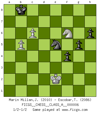 Last move : 1/2-1/2 2007 April 11 21:31:0 [Event "FICGS__CHESS__CLASS_A__000006"] [Site "FICGS"] [Date "2006.08.01"] [Round "1"] [White "Marin Millan,Jose Antonio"] [Black "Escobar,Telmo"] [Result "1/2-1/2"] [WhiteElo "2010"] [BlackElo "2086"] 1.e4 c5 2.Nf3 d6 3.d4 cxd4 4.Nxd4 Nf6 5.Nc3 g6 6.Be3 Bg7 7.f3 O-O 8.Qd2 Nc6 9.Bc4 Bd7 10.Nxc6 bxc6 11.O-O Qa5 12.Rad1 Rfd8 13.Bb3 Rab8 14.Qf2 a6 15.Ne2 Qc7 16.c3 c5 17.e5 dxe5 18.Bxc5 Bb5 19.Rxd8+ Qxd8 20.c4 Bc6 21.Nc3 Qc7 22.Be3 e6 23.Rd1 Rd8 24.Rxd8+ Qxd8 25.Bg5 h6 26.Qd2 Qxd2 27.Bxd2 e4 28.Ba4 Bxa4 29.Nxa4 exf3 30.gxf3 Nd7 31.Kf2 Kf8 32.f4 Ke7 33.Bb4+ Kd8 34.Bc3 Bxc3 35.Nxc3 g5 36.Ke3 f5 37.b4 e5 38.fxe5 Nxe5 39.c5 Ng4+ 40.Ke2 Nxh2 41.a4 f4 42.Nd5 Ng4 43.b5 axb5 44.axb5 Ne5 45.c6 Kc8 46.Nf6 Kb8 1/2-1/2 Sicilian : Dragon, Yugoslav attack, 7...O-O Kingside Castling by player Black (move 7) Kingside Castling by player White (move 11) 10 pieces endgame at move 43 : White KNPP , Black KNPPPP WHITE : King + 1 Knight 2 Pawns BLACK : King + 1 Knight 4 Pawns 9 pieces endgame at move 44 : White KNPP , Black KNPPP WHITE : King + 1 Knight 2 Pawns BLACK : King + 1 Knight 3 Pawns This chess game ended in a draw. Follow this game move after move (download)Not only will I predict his triumph over Botvinnik, but I'll go further and say that he'll probably be the greatest Chess player that ever lived. (John Collins) Nicht daß Diemer aus Opportunismus Mitglied der NSDAP geworden wäre. Er war ein Fanatiker, in allem, was er tat. (Hans Ree) No hay precio que no valga la pena por la cabellera del Rey enemigo. (Koblentz) Les échecs sont un jeu terrible. Si vous n'avez pas le centre, votre adversaire a une position plus libre. Par contre, si vous avez le centre, alors vous avez vraiment quelque chose pour laquelle vous inquiéter ! (Siegbert Tarrasch) Wikichess, chess moves explained by 'experimented' players. (Thibault de Vassal)