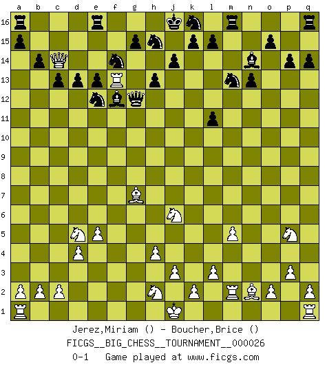 Last move : 0-1 2008 December 17 0:26:35 [Event "FICGS__BIG_CHESS__TOURNAMENT__000026"] [Site "FICGS"] [Date "2008.08.16"] [Round "1"] [White "Jerez,Miriam"] [Black "Boucher,Brice"] [Result "0-1"] [WhiteElo ""] [BlackElo ""] 1.g1-f3 e15-e13 2.m2-m4 d15-d13 3.h2-j4 m15-m13 4.n2-n4 p15-p14 5.b1-c3 o16-p15 6.j4-h6 f16-b12 7.d2-d4 n15-n13 8.h6-g8 l16-n14 9.c1-p13 p16-o14 10.g8-h10 q15-q14 11.p13-k8 m13-m12 12.p1-o3 c16-j10 13.l1-m2 b12-m2 14.m1-m2 f15-f13 15.h10-j12 j15-k13 16.j2-k4 k13-l11 17.j12-l11 m12-l11 18.l2-l3 b16-d15 19.g2-g3 g16-f14 20.h3-h4 h16-k14 21.k4-l6 j10-h9 22.m4-m5 o14-m13 23.l6-j7 h9-e12 24.f1-n8 h14-h13 25.j7-k9 k14-k9 26.k8-h6 b15-b14 27.p2-p3 k9-p4 28.o1-n2 p4-n4 29.n8-l6 n4-n12 30.e2-e4 p15-o14 31.l6-e12 f14-e12 32.h1-l4 o14-n15 33.o3-p5 n12-f12 34.k1-h2 c15-c13 35.f3-g5 f12-f2 36.l4-b13 d15-f14 37.e1-f1 f2-g3 38.f1-f13 g3-d6 39.h6-g7 n15-h10 40.e4-e5 d6-d12 41.c3-d5 h10-f12 42.b13-c14 d12-g9 43.g5-j6 g9-g12 0-1 Follow this game move after move (download)I won't play with you anymore. You have insulted my friend. - When an opponent cursed himself for a blunder. (Miguel Najdorf) Schach ist ein Teil der Kultur, und wenn es mit der Kultur abwärts geht, geht es auch mit dem Schach abwärts. (Mikhail Moiseyevich Botvinik) Si tu oponente te ofrece un empate, trata de averiguar porque piensa él que esta en una posición peor. (Nigel Short) Echiquier : carré parfait, comme la Jérusalem nouvelle décrite par l'auteur de l'Apocalypse, huit cases sur huit, exaltation du chiffre 4, symbole du cosmos aux quatre horizons... où le noir et le blanc, l'ombre et la lumière, le mal et le bien s'entremêlent et se conjuguent. (Robert Couffignal, Le Gambit du poète) The best teachers teach from the heart, not from the book. (Author unknown)