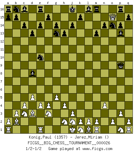 Last move : 1/2-1/2 2008 November 30 18:23:35 [Event "FICGS__BIG_CHESS__TOURNAMENT__000026"] [Site "FICGS"] [Date "2008.08.16"] [Round "1"] [White "Konig,Paul"] [Black "Jerez,Miriam"] [Result "1/2-1/2"] [WhiteElo "1357"] [BlackElo ""] 1.g2-g4 d15-d13 2.f2-f4 e15-e14 3.e2-e4 h15-g13 4.d2-d4 g15-g14 5.d4-d5 c15-c14 6.c2-c4 p15-p14 7.b1-c3 n15-n14 8.g1-f3 p16-o14 9.f1-d3 f16-a11 10.b2-b3 m15-m13 11.c1-b2 k16-l14 12.h3-h4 j15-k13 13.n2-n4 o16-q14 14.g4-g5 g16-f14 15.h1-g2 k13-j11 16.g2-o9 q14-p13 17.o9-o11 f14-h13 18.o1-e10 l14-n13 19.o11-q11 h13-g11 20.q11-j11 a11-d8 21.j11-j9 g11-e10 22.j9-n13 h16-p9 23.p2-p3 o14-m15 24.n13-l11 h14-h13 25.l11-l15 m15-o14 26.l15-o15 q16-o16 27.o15-p15 o16-p16 28.p15-o15 1/2-1/2 Follow this game move after move (download)Chess is mental torture. (Garry Kasparov) Wir können eben der zündenden Macht des Opfers nicht wiederstehen, denn die Begeisterung für das Opfer liegt in der Natur des Menschen. (Rudolf Spielmann) El Ajedrez es un juego terrible. Si no dominas el centro, tu oponente tiene una posición mas libre. Si tu tienes el centro, entonces realmente tienes algo de que preocuparte. (Siegbert Tarrasch) Demandez au pauvre Cg1 ce qu'il en pense. Eduard Gufeld à propos de la variante Saemisch de l'Est-Indienne. Life is painting a picture, not doing a sum. (Oliver Wendell Holmes, Jr.)