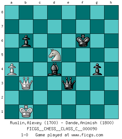 Last move : 1-0 2008 October 18 17:34:10 [Event "FICGS__CHESS__CLASS_C__000090"] [Site "FICGS"] [Date "2008.08.16"] [Round "1"] [White "Ruslin,Alexey"] [Black "Dande,Animish"] [Result "1-0"] [WhiteElo "1700"] [BlackElo "1800"] 1.d4 Nf6 2.Nf3 g6 3.Bf4 Bg7 4.e3 O-O 5.Bd3 d5 6.Nbd2 Nbd7 7.Qe2 Nh5 8.Bg3 c5 9.c3 Nxg3 10.hxg3 a5 11.O-O-O a4 12.Ng5 Nf6 13.f3 c4 14.Bc2 a3 15.b3 cxb3 16.Nxb3 Qc7 17.g4 Qxc3 18.Rd3 Qb4 19.Qf2 b6 20.Nxh7 Nxh7 21.Qh4 Nf6 22.g5 Rd8 23.gxf6 Bxf6 24.Qe1 Qd6 25.Rd1 Ba6 26.Kb1 e5 27.Qd2 Rac8 28.Rc1 exd4 29.exd4 Re8 30.Rhe1 Qg3 31.Rxe8+ Rxe8 32.Bd3 Bxd3+ 33.Qxd3 Qxg2 34.Qc3 Re2 35.Rc2 Qg1+ 36.Nc1 Bxd4 37.Qxa3 Rxc2 38.Kxc2 Qf2+ 39.Kb1 Bc5 40.Qa8+ Kg7 41.Qxd5 Bd4 42.Qb3 f5 43.a3 Kf6 44.a4 g5 45.Na2 g4 46.fxg4 fxg4 47.Nc3 Qe3 48.Nd5+ 1-0 King's Indian : London system Kingside Castling by player Black (move 4) Queenside Castling by player White (move 11) 10 pieces endgame at move 46 : White KQNPP , Black KQBPP WHITE : King + 1 Queen 1 Knight 2 Pawns BLACK : King + 1 Queen 1 Bishop 2 Pawns 9 pieces endgame at move 46 : White KQNP , Black KQBPP WHITE : King + 1 Queen 1 Knight 1 Pawn BLACK : King + 1 Queen 1 Bishop 2 Pawns Player White won this chess game. Follow this game move after move (download)Becoming successful at Chess allows you to discover your own personality. That's what I want for the kids I teach. (Saudin Robovic) Ein Isolani verdüstert die Stimmung auf dem ganzen Schachbrett. (Savielly Grigorievitsch Tartakower) No hay un Gran Maestro de Ajedrez que sea normal; solo se diferencían ellos por la magnitud de su locura. (Viktor Korchnoi) Le temps de noter son nom sur la feuille de partie, j'étais déjà en zeitnot ! D'un modeste amateur apparié lors de la première ronde d'un open contre le grand-maître Azmaïparashvili. The real danger is not that computers will begin to think like men, but that men will begin to think like computers. (Sydney J. Harris)