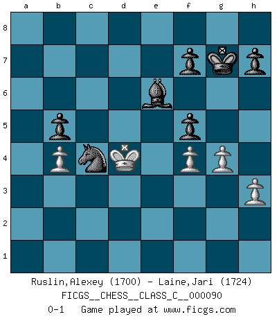 Last move : 0-1 2008 September 23 14:15:21 [Event "FICGS__CHESS__CLASS_C__000090"] [Site "FICGS"] [Date "2008.08.16"] [Round "1"] [White "Ruslin,Alexey"] [Black "Laine,Jari"] [Result "0-1"] [WhiteElo "1700"] [BlackElo "1724"] 1.d4 Nf6 2.Nf3 e6 3.Bf4 b6 4.e3 Be7 5.Bd3 Bb7 6.Nbd2 d6 7.Qe2 Nbd7 8.e4 c5 9.c3 cxd4 10.cxd4 Rc8 11.O-O O-O 12.Rfc1 Rxc1+ 13.Rxc1 Qb8 14.h3 Rc8 15.Qe1 Rxc1 16.Qxc1 e5 17.dxe5 dxe5 18.Nxe5 Nxe5 19.Nc4 Nxd3 20.Bxb8 Nxc1 21.Bxa7 b5 22.Nd2 Nxe4 23.Nxe4 Bxe4 24.a3 Nd3 25.Bd4 Bf6 26.Bxf6 gxf6 27.f3 Bd5 28.b4 Nb2 29.Kf2 Nc4 30.Ke2 Nxa3 31.Kd3 Nc4 32.Kd4 Be6 33.g4 Kg7 34.f4 f5 0-1 Queen's pawn game Kingside Castling by player White (move 11) Kingside Castling by player Black (move 11) Player Black won this chess game. Follow this game move after move (download)Combinations have always been the most intriguing aspect of Chess. The masters look for them, the public applauds them, the critics praise them. It is because combinations are possible that Chess is more than a lifeless mathematical exercise. They are the poetry of the game; they are to Chess what melody is to music. They represent the triumph of mind over matter. (Reuben Fine) Fischer machte Schach einfach zu einer aufregenden Sache, wann immer er sich ans Brett setzte. (Raymond Keene) Una de estas pequeñas movidas modestas pudieran ser mas molestas a tu oponente que la amenaza mas grande. (Siegbert Tarrasch) Les sacrifices démontrent seulement que quelqu'un a gaffé. (Savielly Tartacover) The greatest con, that he ever pulled... was making you believe... that he is you. (Revolver, movie)