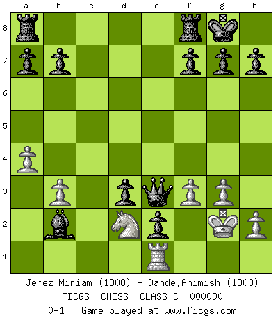 Last move : 0-1 2008 October 12 0:36:18 [Event "FICGS__CHESS__CLASS_C__000090"] [Site "FICGS"] [Date "2008.08.16"] [Round "1"] [White "Jerez,Miriam"] [Black "Dande,Animish"] [Result "0-1"] [WhiteElo "1800"] [BlackElo "1800"] 1.e4 c5 2.c4 Nc6 3.Nf3 Nf6 4.d3 e6 5.g3 d5 6.exd5 exd5 7.Bg5 d4 8.Bg2 Be7 9.Nbd2 Bf5 10.Bxf6 Bxf6 11.Nb3 Qe7+ 12.Qe2 Bxd3 13.O-O Bxe2 14.Rfe1 O-O 15.Bf1 d3 16.Bxe2 dxe2 17.Rab1 Qe4 18.Nfd2 Qd3 19.Kg2 Nd4 20.Nxd4 cxd4 21.Nb3 Qxc4 22.Nd2 Qd5+ 23.f3 d3 24.b3 Qd4 25.a4 Qe3 26.Rb2 Bxb2 0-1 Sicilian defense Kingside Castling by player White (move 13) Kingside Castling by player Black (move 14) Player Black won this chess game. Follow this game move after move (download)We like to think. (Gary Kasparov) Auf Remis zu spielen ist gewissermaßen ein Verbrechen gegen das Schachspiel. (Mikhail Nekhemyevich Tal) Sin errores no puede haber brillantez. (Emanuel Lasker) Mais l'homme est une créature légère et illogique : semblable au joueur d'échecs, il n'aime que le processus du but à atteindre, non le but lui-même. (Dostoïevsky) Always be a first-rate version of yourself, instead of a second-rate version of somebody else. (Judy Garland)