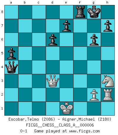 Last move : 0-1 2006 November 26 2:51:32 [Event "FICGS__CHESS__CLASS_A__000006"] [Site "FICGS"] [Date "2006.08.01"] [Round "1"] [White "Escobar,Telmo"] [Black "Aigner,Michael"] [Result "0-1"] [WhiteElo "2086"] [BlackElo "2180"] 1.e4 g6 2.d4 d6 3.Nc3 Bg7 4.Bg5 a6 5.Qd2 b5 6.f3 Nd7 7.h4 c5 8.Be3 cxd4 9.Bxd4 Bxd4 10.Qxd4 Ngf6 11.a4 bxa4 12.h5 Rb8 13.hxg6 fxg6 14.Nxa4 Qa5+ 15.Qd2 Rb4 16.Ra3 Ne5 17.Be2 O-O 18.Nc3 Qb6 19.Na4 Qb8 20.b3 a5 21.Nc3 Qb6 22.Na4 Qc7 23.Nh3 Nh5 24.c3 Ng3 25.Rh2 Nxe2 26.Kxe2 Rxe4+ 27.fxe4 Ba6+ 28.c4 Bxc4+ 29.bxc4 Qxc4+ 30.Rd3 Qxe4+ 31.Qe3 Qg4+ 32.Ke1 Nxd3+ 33.Qxd3 Qxa4 0-1 Comment by player 1 : Telmo Escobar : A fine game by Aigner! Robatsch (Modern) defense Kingside Castling by player Black (move 17) Player Black won this chess game. Follow this game move after move (download)Play the opening like a book, the middle game like a magician, and the endgame like a machine. (Spielmann) Charakterschwächen offenbaren sich normalerweise während einer Schachpartie. (Garry Kasparov) No hay precio que sea tan grande por la cabellera del Rey enemigo. (Koblentz) Mon pion favori sur ma case favorite ! Bronstein en parlant d'un coup de pion en h5 quand il avait les Noirs. I think your argument is specious - I think your tie is ugly. (Gregory House to Dr. Foreman, House M.D.)