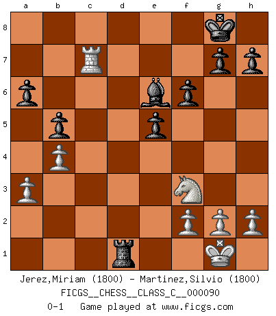 Last move : 0-1 2008 October 11 2:51:46 [Event "FICGS__CHESS__CLASS_C__000090"] [Site "FICGS"] [Date "2008.08.16"] [Round "1"] [White "Jerez,Miriam"] [Black "Martinez,Silvio"] [Result "0-1"] [WhiteElo "1800"] [BlackElo "1800"] 1.e4 e5 2.Nf3 Nc6 3.Bc4 Nf6 4.O-O d5 5.exd5 Nxd5 6.d3 a6 7.Bg5 f6 8.Bd2 Bc5 9.Nc3 Nxc3 10.Bxc3 b5 11.Bb3 Bb7 12.Be6 Bc8 13.b4 Bxb4 14.Bxb4 Bxe6 15.a3 Nxb4 16.c3 Qxd3 17.cxb4 Qxd1 18.Rfxd1 O-O 19.Rac1 Rad8 20.Rxd8 Rxd8 21.Rxc7 Rd1+ 0-1 Two knights defense Kingside Castling by player White (move 4) Kingside Castling by player Black (move 18) Player Black won this chess game. Follow this game move after move (download)Chess is ruthless: you've got to be prepared to kill people. (Nigel Short) Spiel ein langweiliges Spiel zu Ende und lustige Dinge können passieren. (Hans Ree) ¿Que sería del Ajedrez sin errores graciosos?. (Kurt Richter) Que feriez-vous si vous étiez en train de jouer aux échecs et que la fin du monde arrive ? Je continuerais à jouer. (Saint Borromée) Children in the dark cause accidents, accidents in the dark cause children. (Unknown)
