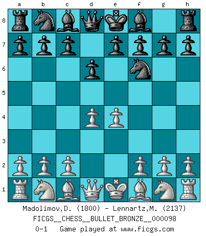 Last move : 0-1 2008 August 16 19:6:8 [Event "FICGS__CHESS__BULLET_BRONZE__000098"] [Site "FICGS"] [Date "2008.08.16"] [Round "1"] [White "Madolimov,Dilshod"] [Black "Lennartz,Manfred"] [Result "0-1"] [WhiteElo "1800"] [BlackElo "2137"] 1.e4 d6 2.d4 Nf6 0-1 King's pawn Opening Player Black won this chess game. Follow this game move after move (download)The Chess pieces are the block alphabet which shapes thoughts; and these thoughts, although making a visual design on the chessboard, express their beauty abstractly, like a poem. (Marcel Duchamp) Ich moechte nie einem Club beitreten, der Leute wie mich als Mitglieder aufnimmt. (Woody Allen) Una clavada es mas poderosa que una espada. (Fred Reinfeld) Toutes les manuvres exécutées sur une colonne ouverte ont pour but ultime l'intrusion définitive sur la septième ou la huitième rangée, en plein cur de la position ennemie. (Aaron Nimzovitch) Perception is reality. (Immanuel Kant)