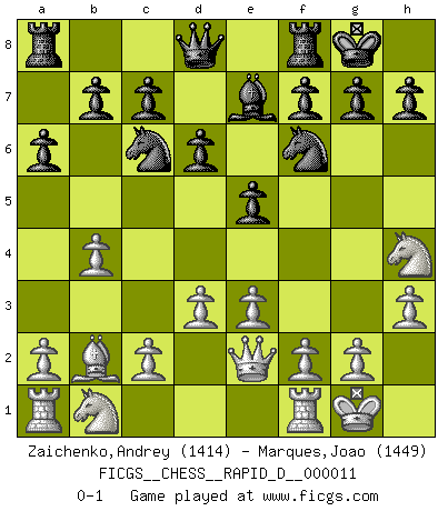 Last move : 0-1 2008 October 10 23:16:54 [Event "FICGS__CHESS__RAPID_D__000011"] [Site "FICGS"] [Date "2008.08.16"] [Round "1"] [White "Zaichenko,Andrey"] [Black "Marques,Joao"] [Result "0-1"] [WhiteElo "1414"] [BlackElo "1449"] 1.b4 e5 2.Bb2 d6 3.e3 Nf6 4.d3 Be7 5.Be2 O-O 6.Nf3 Bg4 7.O-O a6 8.h3 Bh5 9.Nh4 Bxe2 10.Qxe2 Nc6 0-1 This chess game has been lost on time (started : 2008.08.16 21:31:21) Polish (Sokolsky) opening Kingside Castling by player Black (move 5) Kingside Castling by player White (move 7) Player Black won this chess game. Follow this game move after move (download)In Chess, just as in life, today's bliss may be tomorrow's poison. (Assaic) Mit sehr nachdenklichem Gesicht schreitet Bobby durch den Turniersaal. Was ist passiert?, fragt Lombardy. Ich stehe schlecht, antwortet Fischer. Lombardy: Dann biete doch einfach Remis an. Fischer: So schlecht stehe ich nun auch wieder nicht! (Robert James Fischer) Me dio la sensación de como si yo estuviera jugando en contra del mismo Ajedrez. - al estar jugando en contra de Robert Fischer (Walter Shipman) Ne tendez aucun piège pour le plaisir ! Ne jouez rien dans l'espoir que l'adversaire réagisse de façon stupide ! Prenez toujours pour acquis que l'adversaire va trouver le meilleur coup ! Ne jouez jamais de coup dans l'espoir que l'adversaire ne voie pas la menace ! Chacun de vos coups doit améliorer la position d'une façon ou d'une autre. Everything in life is luck. (Donald Trump)