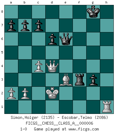 Last move : 1-0 2007 January 3 13:8:48 [Event "FICGS__CHESS__CLASS_A__000006"] [Site "FICGS"] [Date "2006.08.01"] [Round "1"] [White "Simon,Holger"] [Black "Escobar,Telmo"] [Result "1-0"] [WhiteElo "2135"] [BlackElo "2086"] 1.d4 Nf6 2.c4 g6 3.Nc3 Bg7 4.e4 d6 5.f3 O-O 6.Be3 Nbd7 7.Nh3 e5 8.d5 Nh5 9.g4 Nf4 10.Nxf4 exf4 11.Bxf4 f5 12.gxf5 gxf5 13.Qd2 fxe4 14.Nxe4 Ne5 15.Be2 Qh4+ 16.Bg3 Qh5 17.Ng5 Bh6 18.f4 Bg4 19.Ne6 Rae8 20.Rg1 Nf3+ 21.Bxf3 Bxf3 22.Kf2 Bg4 23.Rae1 Qh3 24.Re3 Rxe6 25.dxe6 Bxf4 26.Ke1 Bxe3 27.Qxe3 Qh5 28.Bf4 Qf5 29.h3 Qb1+ 30.Qc1 Qe4+ 31.Be3 h5 32.hxg4 hxg4 33.Kd2 Rf3 34.Qc3 Qxe6 35.Qd4 g3 36.Rh1 1-0 Comment by player 2 : Telmo Escobar : I King's Indian : Saemisch, 5...O-O Kingside Castling by player Black (move 5) Player White won this chess game. Follow this game move after move (download)A chess genius has died; a loss for humanity. (Viktor Kortchnoi, about Bobby Fischer's death) Ich habe die besten Aussichten, den ersten Preis zu gewinnen - denn jeder muss gegen Steinitz spielen, nur ich nicht! (Wilhelm Steinitz) Yo tuve un dolor de muelas en la primer partida. En el segundo juego, tuve un dolor de cabeza. En el tercero, tuve un ataque de reumatísmo. En la cuarta partida, no me sentía muy bien. ¿Y en el quinto juego? Bueno, ¿que acaso uno tiene que ganar todos los juegos?. (Siegbert Tarrasch) J'apprécie les joueurs d'est-indienne, c'est grâce à eux que je nourris ma famille depuis tant d'années. (Petrosian) There are more things in heaven and earth than practically anywhere else. (Unknown)