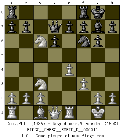 Last move : 1-0 2008 October 17 12:7:5 [Event "FICGS__CHESS__RAPID_D__000011"] [Site "FICGS"] [Date "2008.08.16"] [Round "1"] [White "Cook,Phil"] [Black "Geguchadze,Alexander"] [Result "1-0"] [WhiteElo "1336"] [BlackElo "1500"] 1.e4 c5 2.Nf3 d6 3.Bb5+ Bd7 4.Bxd7+ Qxd7 5.O-O Nc6 6.d4 cxd4 7.Nxd4 Nf6 8.Nc3 g6 9.f3 Bg7 10.Re1 O-O 11.Nxc6 1-0 This chess game has been lost on time (started : 2008.08.16 21:31:21) Sicilian : Canal-Sokolsky attack, 3...Bd7 Kingside Castling by player White (move 5) Kingside Castling by player Black (move 10) Player White won this chess game. Follow this game move after move (download)Chess teaches you to control the initial excitement you feel when you see something that looks good and it trains you to think objectively when you're in trouble. (Stanley Kubrick) Capablanka war das größte Genie der Schachgeschichte! Aber denken sie nicht er habe nichts vom Schach verstanden. Er wusste nur soviel wie er wissen musste um seine Ziele zu erreichen. (Mikhail Moiseyevich Botvinik) Yo he agregado estos principios a la ley: pongan los Caballos en acción antes de que los dos Alfiles sean desarrollados. (Emanuel Lasker) Aucun coup ne doit être joué sans but. (Pedro Damiano) However beautiful the strategy, you should occasionally look at the results. (Winston Churchill)