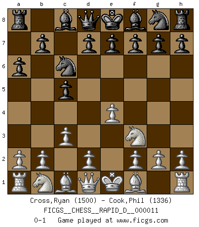 Last move : 0-1 2008 September 21 22:14:50 [Event "FICGS__CHESS__RAPID_D__000011"] [Site "FICGS"] [Date "2008.08.16"] [Round "1"] [White "Cross,Ryan"] [Black "Cook,Phil"] [Result "0-1"] [WhiteElo "1500"] [BlackElo "1336"] 1.e4 c5 2.c3 Nc6 3.Nf3 a6 0-1 This chess game has been lost on time (started : 2008.08.16 21:31:21) Sicilian : Alapin's variation (2.c3) Player Black won this chess game. Follow this game move after move (download)Suddenly it was obvious to me in my analysis I had missed what Fischer had found with the greatest of ease at the board. (Mikhail Botvinnik) Kleine Schachspieler machen Mist, und große Schachspieler machen Mist, aber große machen weniger Mist. (Fritz Sämisch) No hay un Gran Maestro de Ajedrez que sea normal; solo se diferencían ellos por la magnitud de su locura. (Viktor Korchnoi) Vous n'êtes pas toujours obligé de jouer le meilleur coup. Un coup doit être actif, entreprenant, correct et beau ! (David Bronstein) Philosophers use a language that is already deformed as though by shoes that are too tight. (Ludwig Wittgenstein)