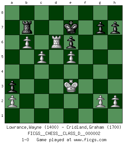 Last move : 1-0 2006 June 26 23:53:1 [Event "FICGS__CHESS__CLASS_D__000002"] [Site "FICGS"] [Date "2006.04.15"] [Round "1"] [White "Lowrance,Wayne"] [Black "Cridland,Graham"] [Result "1-0"] [WhiteElo "1400"] [BlackElo "1700"] 1.e4 c5 2.Nf3 Nc6 3.d4 cxd4 4.Nxd4 e6 5.Nc3 Qc7 6.Be2 a6 7.O-O Nf6 8.Be3 Bb4 9.Nxc6 bxc6 10.Qd4 Bd6 11.f4 e5 12.Qd2 Rb8 13.Rad1 exf4 14.Qxd6 Qxd6 15.Rxd6 fxe3 16.b3 Bb7 17.e5 Nd5 18.Ne4 Ke7 19.c4 Nc7 20.Bg4 Ne6 21.Bxe6 fxe6 22.Nc5 Bc8 23.Rf3 Ra8 24.Kf1 Ra7 25.Ke2 Rf8 26.Rxf8 Kxf8 27.Nxe6+ dxe6 28.Rd8+ Kf7 29.Rxc8 a5 30.Rxc6 a4 31.b4 a3 32.b5 Ke7 33.b6 Rb7 34.c5 Kd7 35.Rd6+ Ke7 36.Kxe3 1-0 Sicilian defense Kingside Castling by player White (move 7) Player White won this chess game. Follow this game move after move (download)Chess is really ninety nine percent calculation. (Soltis) Obwohl ich vom Stil her kaum zu den Priestern der Schachkunst gezählt werde, halte ich Schach doch für eine Kunst. (Tigran Petrosjan) Durante una competencia de Ajedrez, un Maestro de Ajedrez deberá ser una combinación de presa de caza y un Monge. (Alexander Alekhine) La solitude du joueur d'Echecs à l'approche du mat est semblable à celle du condamné. (Francis Szpiner) Dave, my mind is going. I can feel it. (HAL 9000 in 2001, a space odyssey)