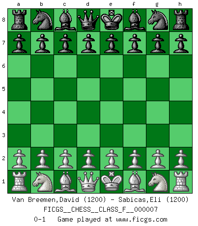 Last move : 0-1 2006 September 11 6:31:21 [Event "FICGS__CHESS__CLASS_F__000007"] [Site "FICGS"] [Date "2006.08.02"] [Round "1"] [White "Van Breemen,David"] [Black "Sabicas,Eli"] [Result "0-1"] [WhiteElo "1200"] [BlackElo "1200"] 0-1 This chess game has been lost on time (started : 2006.08.02 2:57:13) Player Black won this chess game. Follow this game move after move (download)I look one move ahead... the best ! (Siegbert Tarrasch) Lisa Lane, amerikanische Schachmeisterin, hatte Fischer einmal als stärksten lebenden Spieler bezeichnet. Antwort: Das ist richtig, aber Lisa Lane ist eigentlich nicht in der Lage, das zu beurteilen. (Robert James Fischer) Un entendimiento a fondo de las continuaciones típicas del mate, hace de las combinaciones de sacrificio mas complicadas conducirlas a ellas no solo sin dificultad, sino casi de una manera natural. (Siegbert Tarrasch) On est toujours la mazette de quelqu'un d'autre. (Anonyme) Go and wake up your luck. (Persian saying)