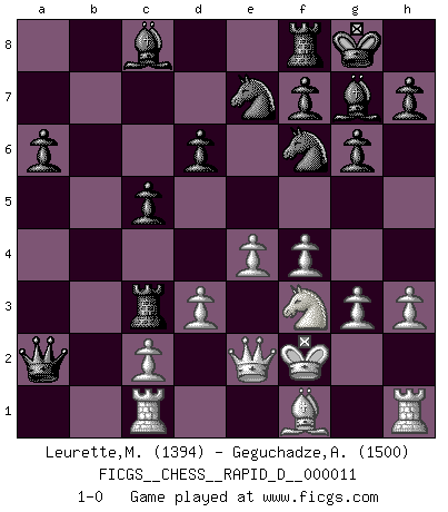 Last move : 1-0 2008 October 13 23:22:30 [Event "FICGS__CHESS__RAPID_D__000011"] [Site "FICGS"] [Date "2008.08.16"] [Round "1"] [White "Leurette,Marc-Antoine"] [Black "Geguchadze,Alexander"] [Result "1-0"] [WhiteElo "1394"] [BlackElo "1500"] 1.e4 c5 2.Nc3 d6 3.f4 Nf6 4.Nf3 g6 5.d3 Bg7 6.Bd2 Nc6 7.Qe2 O-O 8.O-O-O a6 9.g3 b5 10.h3 Qa5 11.Nd5 Qxa2 12.Bc3 b4 13.Kd2 bxc3+ 14.bxc3 Rb8 15.Nxe7+ Nxe7 16.Rc1 Rb3 17.Ke1 Rxc3 18.Kf2 1-0 This chess game has been lost on time (started : 2008.08.16 21:31:21) Sicilian : Closed Kingside Castling by player Black (move 7) Queenside Castling by player White (move 8) Player White won this chess game. Follow this game move after move (download)Best by test: 1. e4 (Bobby Fischer) Du musst nicht gut spielen, es reicht, wenn du besser spielst als dein Gegner. (Anonymous) Vive, pierde y aprende al observar a tu oponente como gana. (Amber Steenbock) Un journaliste : 'Vous préférez avoir une dame de plus sur l'échiquier ou au lit ?' Boris Spassky : 'Ca dépend de la position.' Every vice is only an exaggeration of a necessary and virtuous function. (Ralph Waldo Emerson, Journals 1936)