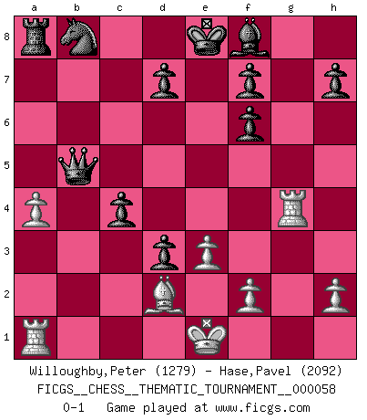 Last move : 0-1 2008 September 6 12:1:43 [Event "FICGS__CHESS__THEMATIC_TOURNAMENT__000058"] [Site "FICGS"] [Date "2008.08.19"] [Round "1"] [White "Willoughby,Peter"] [Black "Hase,Pavel"] [Result "0-1"] [WhiteElo "1279"] [BlackElo "2092"] 1.d4 Nf6 2.c4 c5 3.d5 b5 4.cxb5 e6 5.Nc3 exd5 6.Bg5 d4 7.Ne4 Bb7 8.Nxf6+ gxf6 9.Bd2 a6 10.a4 Qb6 11.e3 Rg8 12.Nf3 Qe6 13.b3 axb5 14.Bxb5 Rxg2 15.Rg1 Bxf3 16.Rxg2 Bxd1 17.Kxd1 Qxb3+ 18.Ke2 c4 19.Rg4 d3+ 20.Ke1 Qxb5 0-1 Benko gambit Player Black won this chess game. Follow this game move after move (download)I know people who have all the will in the world, but still can't play good Chess. (Bobby Fischer) Aljechin war kein Nazi. Er war ein Opportunist. Ein schrecklicher Mann. Er liebte Geld über alles und würde für Geld ein Jude, ein Katolik oder ein Protestant werden. (Miguel Najdorf) El Ajedrez es 99 por ciento táctica. (Teichmann) Le succès, c'est être capable d'aller d'échec en échec sans perdre son enthousiasme. (Winston Churchill) Good decisions come from experience, and experience comes from bad decisions. (Anonymous)