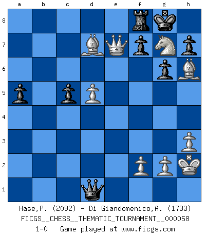 Last move : 1-0 2008 September 23 17:35:59 [Event "FICGS__CHESS__THEMATIC_TOURNAMENT__000058"] [Site "FICGS"] [Date "2008.08.19"] [Round "1"] [White "Hase,Pavel"] [Black "Di Giandomenico,Alfonso"] [Result "1-0"] [WhiteElo "2092"] [BlackElo "1733"] 1.d4 Nf6 2.c4 c5 3.d5 b5 4.Nd2 bxc4 5.e4 c3 6.bxc3 g6 7.Bd3 Bg7 8.Ngf3 O-O 9.O-O d6 10.Rb1 Bg4 11.h3 Bxf3 12.Nxf3 Nbd7 13.Qc2 Qc7 14.Be2 Rfb8 15.Rb3 Nh5 16.Be3 Nhf6 17.Rfb1 Nb6 18.Bb5 Nbd7 19.Nd2 a6 20.Bc6 Rxb3 21.axb3 Rb8 22.Ra1 a5 23.Nc4 Nxe4 24.Qxe4 Bxc3 25.Qxe7 Bxa1 26.Nxd6 Rf8 27.Bxd7 Qb6 28.Ne8 Qxb3 29.Bh6 Qd1+ 30.Kh2 Bg7 31.Nxg7 1-0 Benko gambit Kingside Castling by player Black (move 8) Kingside Castling by player White (move 9) Player White won this chess game. Follow this game move after move (download)Fischer Chess play was always razor-sharp, rational and brilliant. One of the best ever. (Dave Regis) Der Bart als Geschlechtszeichen mitten im Gesicht ist obszön. Daher gefällt er den Weibern. [Zugegeben, kein Schachzitat, aber unglaublich originell] (Arthur Schopenhauer) Con el tiempo, empecé a progresar en partidas decisivas. Tal vez porque me di cuenta de una simple verdad: no solo estaba yo nervioso sino también mi oponente. (Mikhail Tal) Tous ces prétendus hommes politiques sont les pions, les Cavaliers, les Tours ou les Fous d'une partie d'échecs qui se jouera tant qu'un hasard ne renversera pas l'échiquier. (Honoré de Balzac) If you don't practice you don't deserve to win. (Andre Agassi)