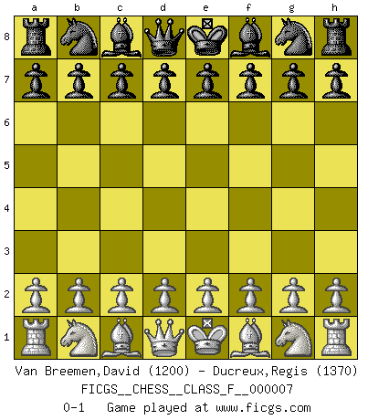 Last move : 0-1 2006 September 11 6:31:21 [Event "FICGS__CHESS__CLASS_F__000007"] [Site "FICGS"] [Date "2006.08.02"] [Round "1"] [White "Van Breemen,David"] [Black "Ducreux,Regis"] [Result "0-1"] [WhiteElo "1200"] [BlackElo "1370"] 0-1 This chess game has been lost on time (started : 2006.08.02 2:57:13) Player Black won this chess game. Follow this game move after move (download)Only the player with the initiative has the right to attack. (Wilhelm Steinitz) Schach verlangt totale Konzentration. (Robert James Fischer) Siempre es mejor sacrificar los hombres de tu oponente. (Savielly Tartakower) Votre seul travail dans les ouvertures est d'obtenir un milieu de partie jouable. (Lajos Portish) A cynic is a man who knows the price of everything but the value of nothing. (Oscar Wilde)