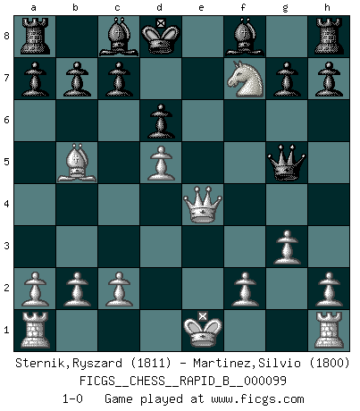 Last move : 1-0 2008 September 28 0:19:19 [Event "FICGS__CHESS__RAPID_B__000099"] [Site "FICGS"] [Date "2008.08.20"] [Round "1"] [White "Sternik,Ryszard"] [Black "Martinez,Silvio"] [Result "1-0"] [WhiteElo "1811"] [BlackElo "1800"] 1.e4 e5 2.Nf3 Nc6 3.d4 Nf6 4.d5 Nd4 5.Nxe5 Nxe4 6.Qxd4 Qh4 7.Nc3 f5 8.g3 Qf6 9.Nxe4 fxe4 10.Qxe4 d6 11.Bb5+ Kd8 12.Bg5 Qxg5 13.Nf7+ 1-0 Scotch Opening Player White won this chess game. Follow this game move after move (download)When you absolutely don't know what to do anymore, it is time to panic. (John van der Wiel) Weshalb minderdergeübte Spieler mit g2-g4 beginnen? Die betreffenden sind unschlüssig, ob sie nun rechts (h4) oder links (f4) beginnen sollen, und in ihrer Ratlosigkeit entschliessen sie sich nach guter Bürgerart dazu, den goldenen Mittelweg zu wählen. (Aaron Nimzowitsch) Del Ajedrez se ha dicho que la vida no es lo suficientemente larga para él, pero eso es culpa de la vida, no del Ajedrez. (William Ewart Napier) Psychologiquement, tu dois avoir confiance en toi même, mais cette confiance doit être basée sur des faits. (Robert Fischer) What doesn't kill us makes us stronger. (Friedrich Nietzsche)