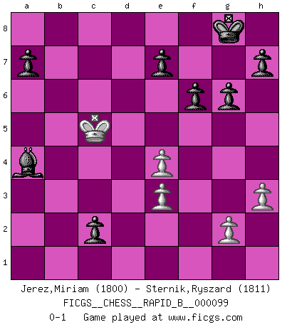 Last move : 0-1 2008 October 26 23:24:46 [Event "FICGS__CHESS__RAPID_B__000099"] [Site "FICGS"] [Date "2008.08.20"] [Round "1"] [White "Jerez,Miriam"] [Black "Sternik,Ryszard"] [Result "0-1"] [WhiteElo "1800"] [BlackElo "1811"] 1.e4 c5 2.c4 g6 3.Nf3 Bg7 4.d4 cxd4 5.Nxd4 Nf6 6.Bd3 Nc6 7.Be3 Nb4 8.O-O Nxd3 9.Qxd3 Ng4 10.Nc3 O-O 11.h3 Nxe3 12.Qxe3 d6 13.b3 Bd7 14.Rab1 Qa5 15.b4 Qb6 16.Nc2 Qxe3 17.Nxe3 Bxc3 18.b5 Bd4 19.Rbd1 Bxe3 20.fxe3 Be6 21.Rd4 Rfc8 22.Rc1 Rc5 23.Rcd1 Rac8 24.a4 Bxc4 25.Kf2 f6 26.Rc1 Bxb5 27.Rxc5 dxc5 28.Rd5 Bxa4 29.Ke2 b5 30.Kd3 c4+ 31.Kc3 b4+ 32.Kxb4 c3 33.Rc5 Rxc5 34.Kxc5 c2 0-1 Sicilian defense Kingside Castling by player White (move 8) Kingside Castling by player Black (move 10) Player Black won this chess game. Follow this game move after move (download)Chess is so inspiring that I do not believe a good player is capable of having an evil thought during the game. (Wilhelm Steinitz) Matt entspricht nicht immer den Tatsachen. (Savielly Grigorievitsch Tartakower) No nos podemos resistir a la fascinación de un sacrificio ya que la pasión por los sacrificios es parte de la naturaleza de un jugador de Ajedrez. (Rudolf Spielman) Botvinnik disait en comparant les échecs à la musique: Il existe une science dont le but est l'étude de l'acoustique et des sons. Mais il y a aussi un art qui se sert de l'océan des sons : c'est la musique. De toute évidence, il en est de même pour la pensée. La logique est l'étude des lois de la réflexion et les échecs reflètent, en tant qu'art, le côté logique de la réflexion, sous la forme d'images artistiques... Extrait de Fischer - Spassky, Reykjavik 1972 par Alexander & F. Wyndham (Ed. Solar), p 37. All maxims have their antagonist maxims; proverbs should be sold in pairs, a single one being but a half truth. (William Mathews)