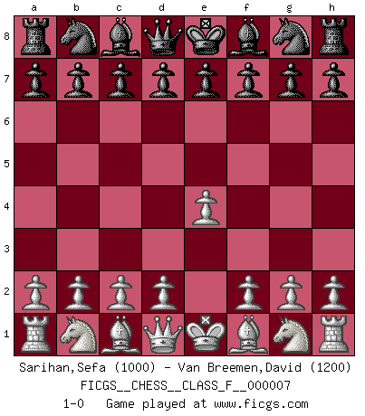 Last move : 1-0 2006 September 11 12:31:24 [Event "FICGS__CHESS__CLASS_F__000007"] [Site "FICGS"] [Date "2006.08.02"] [Round "1"] [White "Sarihan,Sefa"] [Black "Van Breemen,David"] [Result "1-0"] [WhiteElo "1000"] [BlackElo "1200"] 1.e4 1-0 This chess game has been lost on time (started : 2006.08.02 2:57:13) King's pawn Opening Player White won this chess game. Follow this game move after move (download)Chess is really ninety nine percent calculation. (Soltis) Obwohl ich vom Stil her kaum zu den Priestern der Schachkunst gezählt werde, halte ich Schach doch für eine Kunst. (Tigran Petrosjan) Aquellos que dicen entender al Ajedrez, no entienden nada. (Robert Hubner) Il s'avisa de me proposer d'apprendre les échecs qu'il jouait un peu... me voilà forcené des échecs. J'achète un échiquier, je m'enferme dans ma chambre, j'y passe des jours et des nuits à vouloir apprendre par cur toutes les parties. (Jean-Jacques Rousseau, Confessions) In fact if nothing is done against this teddy bear, hereby I announce that I would quit chess, rapid chess, blitz chess, postal chess, email chess, server chess and correspondence chess I will then switch to a table game where teddy bears aren't going to be seen for a while, like Poker, or Roulette, all 18+ games. (Elmer Valderrama)