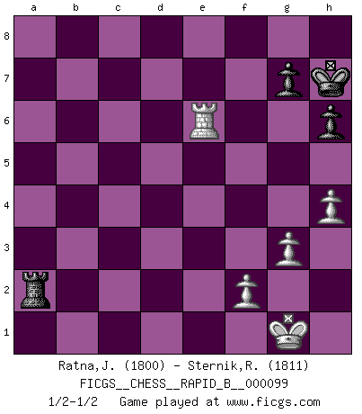 Last move : 1/2-1/2 2008 September 2 3:49:45 [Event "FICGS__CHESS__RAPID_B__000099"] [Site "FICGS"] [Date "2008.08.20"] [Round "1"] [White "Ratna,Jean-Michel"] [Black "Sternik,Ryszard"] [Result "1/2-1/2"] [WhiteElo "1800"] [BlackElo "1811"] 1.e4 c5 2.Nf3 Nc6 3.d4 cxd4 4.Nxd4 Nf6 5.Nc3 e5 6.Ndb5 d6 7.Bg5 a6 8.Na3 b5 9.Nd5 Be7 10.Bxf6 Bxf6 11.c3 O-O 12.Nc2 Bg5 13.a4 bxa4 14.Rxa4 a5 15.Bc4 Rb8 16.b3 Kh8 17.Nce3 Bxe3 18.Nxe3 Ne7 19.O-O f5 20.exf5 Bxf5 21.Ra2 Bg6 22.Qd2 Be4 23.Rd1 d5 24.Nxd5 Bxd5 25.Bxd5 Nxd5 26.Qxd5 Qxd5 27.Rxd5 Rxb3 28.g3 e4 29.Rdxa5 Rxc3 30.Re2 Rc4 31.Re5 h6 32.R5xe4 Rxe4 33.Rxe4 Kh7 34.h4 Ra8 35.Re6 Ra2 1/2-1/2 Sicilian : Pelikan (Lasker/Sveshnikov) variation Kingside Castling by player Black (move 11) Kingside Castling by player White (move 19) 10 pieces endgame at move 32 : White KRPPP , Black KRRPP WHITE : King + 1 Rook 3 Pawns BLACK : King + 2 Rooks 2 Pawns 9 pieces endgame at move 33 : White KRPPP , Black KRPP WHITE : King + 1 Rook 3 Pawns BLACK : King + 1 Rook 2 Pawns This chess game ended in a draw. Follow this game move after move (download)The tactician must know what to do whenever something needs doing; the strategist must know what to do when nothing needs doing. (Savielly Tartakover) Was ist der Unterschied zwischen einem Strassenarbeiter und einem Schachspieler? --Der Schachspieler bewegt sich ab und zu. (Anonymous) Todo se encuentra en un estado de flujo y esto incluye al mundo del Ajedrez. (Mikhail Botvinnik) Je ne suis pas le dernier à jouer lâchement des coups douteux pendant le zeïtnot de l'adversaire pour l'achever: en effet les coups qui font le plus peur sont ceux que l'on ne comprend pas. Je me fais souvent peur quand je joue. (Un professeur anonyme) Chess is everything: art, science and sport. (Anatoly Karpov)