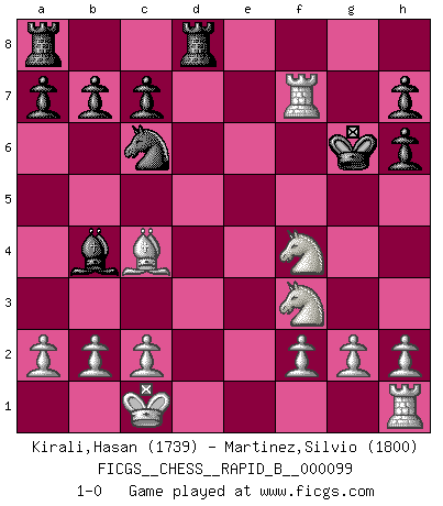 Last move : 1-0 2008 September 28 0:11:50 [Event "FICGS__CHESS__RAPID_B__000099"] [Site "FICGS"] [Date "2008.08.20"] [Round "1"] [White "Kirali,Hasan"] [Black "Martinez,Silvio"] [Result "1-0"] [WhiteElo "1739"] [BlackElo "1800"] 1.e4 e5 2.d4 d5 3.dxe5 dxe4 4.Qxd8+ Kxd8 5.Nc3 Nc6 6.Bf4 Bb4 7.O-O-O Bd7 8.Nxe4 Nh6 9.Bxh6 gxh6 10.Nf6 Ke7 11.Rxd7+ Ke6 12.Bc4+ Kxe5 13.Nh5 Rhd8 14.Nf3+ Kf5 15.Rxf7+ Kg6 16.Nf4+ 1-0 King's pawn game Queenside Castling by player White (move 7) Player White won this chess game. Follow this game move after move (download)We like to think. (Gary Kasparov) Wer nie einen Fehler gemacht hat, hat nie etwas Neues ausprobiert. (Albert Einstein) La caracteristica mas importante en la posición del Ajedrez es la actividad de las piezas. Esto es absolutamente fundamental en todas las fases del juego: Apertura, Juego Medio y especialmente Finales. La limitación primordial en la actividad de una pieza, es la estructuración de los Peones. (Michael Stean) Horreur, mais aussi harmonie suprême : qu'y avait-il en effet au monde en dehors des échecs ? Le brouillard, l'inconnu, le non-être... (Vladimir Nabokov) Lamb in skin of tiger, still fears the wolf. (Chinese proverb)