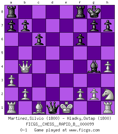Last move : 0-1 2008 October 9 3:24:25 [Event "FICGS__CHESS__RAPID_B__000099"] [Site "FICGS"] [Date "2008.08.20"] [Round "1"] [White "Martinez,Silvio"] [Black "Hladky,Ostap"] [Result "0-1"] [WhiteElo "1800"] [BlackElo "1800"] 1.e4 e5 2.Nf3 Nc6 3.Nc3 Nf6 4.Bc4 Nxe4 5.Qe2 Nxc3 6.dxc3 d6 7.Ng5 d5 8.Bb3 Be7 9.h4 f6 10.Nf3 Na5 11.Qb5+ c6 12.Qe2 Bg4 13.Qe3 Qd7 14.a3 Nxb3 15.cxb3 O-O 16.b4 Bd6 17.Nh2 d4 18.cxd4 exd4 19.Qxd4 Bxb4+ 20.Qxb4 Qd1+ 0-1 Four knights : Italian variation Kingside Castling by player Black (move 15) Player Black won this chess game. Follow this game move after move (download)My style is somewhere between that of Tal and Petrosian. (Reshevsky) Es ist besser die Steine des Gegners zu opfern. (Savielly Grigorievitsch Tartakower) Las combinaciones han sido siempre el aspecto más intrigante del Ajedrez. Los Maestros las buscan, el público las aplauden, los críticos las alaban. La razón se debe a que las combinaciones hacen posible que el Ajedrez sea más que un ejercicio matemático con una carencia de vida. Ellas son la poesía del juego, son del Ajedrez lo que la melodía es de la música. Ellas representan el triunfo de la mente sobre la materia. (Reuben Fine) Shah mat. Le roi est mort. Cri de fierté d'un joueur venant de terrasser son adversaire, courtoisement, sans effusion de sang. You must do what you feel is right... of course. (Obi-Wan Kenobi in Star Wars ep.4)