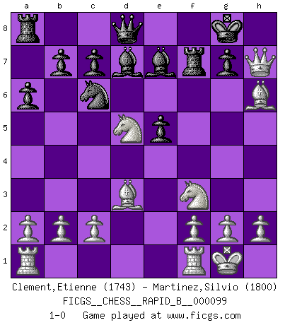Last move : 1-0 2008 October 13 0:36:52 [Event "FICGS__CHESS__RAPID_B__000099"] [Site "FICGS"] [Date "2008.08.20"] [Round "1"] [White "Clement,Etienne"] [Black "Martinez,Silvio"] [Result "1-0"] [WhiteElo "1743"] [BlackElo "1800"] 1.e4 e5 2.Nf3 Nc6 3.Bb5 Nf6 4.O-O Nxe4 5.d4 Be7 6.Qe2 O-O 7.Qxe4 Bf6 8.dxe5 d5 9.Qf4 Be7 10.Nc3 Bd7 11.Nxd5 a6 12.Bd3 f6 13.Qh4 fxe5 14.Qxh7+ Kf7 15.Qg6+ Kg8 16.Bh6 Rf7 17.Qh7+ 1-0 Ruy Lopez : Open Berlin defense, 5...Be7 Kingside Castling by player White (move 4) Kingside Castling by player Black (move 6) Player White won this chess game. Follow this game move after move (download)The game of chess is the touchstone of the intellect. (Goethe) Wenn Spassky eine Figur opfert kannst du genauso gut aufgeben. Aber wenn Tal eine Figur opfert, spiel weiter. Er könnte noch eine weitere opfern, und dann ... wer weiß? (Miguel Najdorf) Aquel que toma al Peón de Caballo de la Reina, se pasará la noche a dormir en la calle. (Anónimo) Tous ces prétendus hommes politiques sont les pions, les Cavaliers, les Tours ou les Fous d'une partie d'échecs qui se jouera tant qu'un hasard ne renversera pas l'échiquier. (Honoré de Balzac) Men never do evil so completely and cheerfully as when they do it from religious conviction. (Blaise Pascal)