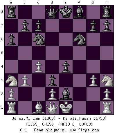 Last move : 0-1 2008 September 27 23:33:21 [Event "FICGS__CHESS__RAPID_B__000099"] [Site "FICGS"] [Date "2008.08.20"] [Round "1"] [White "Jerez,Miriam"] [Black "Kirali,Hasan"] [Result "0-1"] [WhiteElo "1800"] [BlackElo "1739"] 1.e4 Nc6 2.Nf3 d5 3.Nc3 d4 4.Nb5 e5 5.c4 a6 6.Na3 f5 7.exf5 e4 8.Ng1 Nf6 9.b3 d3 10.Nh3 Bxf5 11.g3 Bg4 12.f3 Bxf3 13.Be2 Bxe2 0-1 KP : Nimzovich defense Player Black won this chess game. Follow this game move after move (download)Before the endgame, the Gods have placed the middle game. (Siegbert Tarrasch) Bobby Fischer ist kein Vorbild für die heutige Jugend. (Viktor Kortschnoi) ¿Esta Bobby Fischer algo cuerdo?. (Salo Flohr) Les pièces de l'échiquier étaient impitoyables. Elles le retenaient, elles l'absorbaient. Il y avait de l'horreur en cela, mais aussi une harmonie unique. Car, qu'y a-t-il dans le monde, à part les échecs ? (V. Nabokov) If everyone is thinking alike, then somebody isn't thinking. (US General George S. Patton)