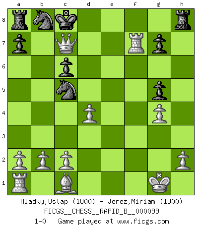 Last move : 1-0 2008 October 9 3:40:33 [Event "FICGS__CHESS__RAPID_B__000099"] [Site "FICGS"] [Date "2008.08.20"] [Round "1"] [White "Hladky,Ostap"] [Black "Jerez,Miriam"] [Result "1-0"] [WhiteElo "1800"] [BlackElo "1800"] 1.e4 e5 2.Nf3 d5 3.exd5 Qxd5 4.Nc3 Qe6 5.Be2 Nf6 6.d4 e4 7.Ng5 Qc6 8.Bb5 Bg4 9.f3 exf3 10.gxf3 Nfd7 11.Bxc6 bxc6 12.fxg4 Bd6 13.Qe2+ Be7 14.O-O h6 15.Rxf7 Kd8 16.Qxe7+ Kc8 17.Nce4 hxg5 18.Nc5 Nxc5 19.Qxc7+ 1-0 QP counter-gambit (elephant gambit) Kingside Castling by player White (move 14) Player White won this chess game. Follow this game move after move (download)Chess is a fairy tale of 1001 blunders. (Savielly Tartakower) Im Schach nämlich geht es darum, daß Ich des Gegners klein zu kriegen, sein Ego zu zerbrechen und zu zermahlen, seine Selbstachtung zu zertreten und zu verscharren und seine ganze mißachtenswerte sogenannte Persönlichkeit ein für alle Mal tot zu hacken und zu zerstampfen und dadurch die menschliche Gesellschaft von einer stinkenden Pestbeule zu befreien. Es ist ein königliches Spiel. (Robert James Fischer) Por tratar de evitar la pérdida de una pieza, muchas personas han perdido una partida de Ajedrez. (Savielly Tartakover) On peut tirer plus d'utilité d'une partie perdue que de 100 parties gagnées. (Capablanca) There is a computer disease that anybody who works with computers knows about. It's a very serious disease and it interferes completely with the work. The trouble with computers is that you 'play' with them ! (Richard P. Feynman)