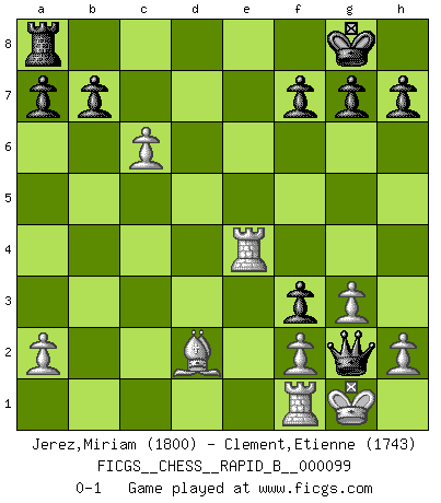 Last move : 0-1 2008 October 28 2:22:29 [Event "FICGS__CHESS__RAPID_B__000099"] [Site "FICGS"] [Date "2008.08.20"] [Round "1"] [White "Jerez,Miriam"] [Black "Clement,Etienne"] [Result "0-1"] [WhiteElo "1800"] [BlackElo "1743"] 1.e4 e6 2.Nf3 d5 3.Nc3 dxe4 4.Nxe4 Nf6 5.c3 Nxe4 6.Qe2 Nf6 7.d4 c5 8.dxc5 Bxc5 9.b4 Bd6 10.g3 O-O 11.Bh3 e5 12.Bxc8 Qxc8 13.Qd2 Rd8 14.O-O Bxb4 15.cxb4 Rxd2 16.Bxd2 Nc6 17.Rac1 Qg4 18.Rc3 e4 19.b5 exf3 20.bxc6 Ne4 21.Rc4 Qh3 22.Rxe4 Qg2+ 0-1 French defense Kingside Castling by player Black (move 10) Kingside Castling by player White (move 14) Player Black won this chess game. Follow this game move after move (download)Chess is the gymnasium of the mind. (Blaise Pascal) Gott hat gewollt, dass ich Champion werde. (Surab Azmajparaschvili) No es una movida, aún la mejor movida que tu debas buscar, sino un plan comprensible. (Eugene Znosko-Borovsky) Le moment que je préfère le plus dans une rencontre, c'est celui où je sens que la personnalité de l'adversaire se brise. (Robert Fischer) A government big enough to give you everything you want is strong enough to take everything you have. (Thomas Jefferson)