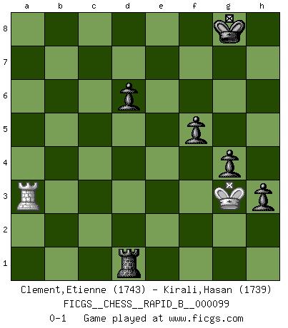 Last move : 0-1 2008 November 6 13:31:16 [Event "FICGS__CHESS__RAPID_B__000099"] [Site "FICGS"] [Date "2008.08.20"] [Round "1"] [White "Clement,Etienne"] [Black "Kirali,Hasan"] [Result "0-1"] [WhiteElo "1743"] [BlackElo "1739"] 1.d4 c5 2.d5 Nf6 3.Nc3 d6 4.e4 g6 5.Nf3 Bg7 6.Bd3 a6 7.O-O b5 8.a4 b4 9.Ne2 Qc7 10.c3 c4 11.Bb1 bxc3 12.Nxc3 Bg4 13.h3 Bxf3 14.Qxf3 Nbd7 15.Rd1 O-O 16.Qe2 Rab8 17.a5 Rb4 18.Ra3 Rfb8 19.Bc2 Nh5 20.g4 Nhf6 21.g5 Nh5 22.Ra2 Nc5 23.Qf3 Be5 24.h4 Qc8 25.Ne2 Bxb2 26.Bd2 c3 27.Be1 Nd7 28.Qe3 Ne5 29.Kf1 Qg4 30.Ng1 Qxh4 31.Qh3 Rxe4 32.Bxc3 Bxc3 33.Bxe4 Qxe4 34.Qxc3 Nf4 35.f3 Qf5 36.Rc2 Qxg5 37.Qe3 h5 38.Rdc1 Rb5 39.Rd1 Qg3 40.Qf2 Qxf2+ 41.Kxf2 Rxa5 42.Rcd2 Ra3 43.Rd4 g5 44.Kg3 h4+ 45.Kh2 Nxf3+ 46.Nxf3 Rxf3 47.Re1 Rf2+ 48.Kg1 Ra2 49.Rxe7 Ne2+ 50.Rxe2 Rxe2 51.Ra4 Rd2 52.Ra5 h3 53.Rxa6 g4 54.Ra3 Rxd5 55.Kh2 f5 56.Kg3 Rd1 0-1 Old Benoni defense Kingside Castling by player White (move 7) Kingside Castling by player Black (move 15) 10 pieces endgame at move 50 : White KRP , Black KRPPPPP WHITE : King + 1 Rook 1 Pawn BLACK : King + 1 Rook 5 Pawns 9 pieces endgame at move 53 : White KRP , Black KRPPPP WHITE : King + 1 Rook 1 Pawn BLACK : King + 1 Rook 4 Pawns 8 pieces endgame at move 54 : White KR , Black KRPPPP WHITE : King + 1 Rook BLACK : King + 1 Rook 4 Pawns Player Black won this chess game. Follow this game move after move (download)The Chess pieces are the block alphabet which shapes thoughts; and these thoughts, although making a visual design on the chessboard, express their beauty abstractly, like a poem. (Marcel Duchamp) In Buenos Aires ist es nicht mein vorrangiges Ziel ein starkes Turnier zu organisieren, sondern ein Turnier für Gentlemen. Ich würde nie Kamsky einladen. Ich mag keine Probleme. (Miguel Najdorf) No nos podemos resistir a la fascinación de un sacrificio ya que la pasión por los sacrificios es parte de la naturaleza de un jugador de Ajedrez. (Rudolf Spielman) Les échecs, c'est la lutte contre l'erreur. (Johannes Zukertort) If you are good, you will be assigned all the work. If you are really good, you will get out of it. (Dan Rotaru)