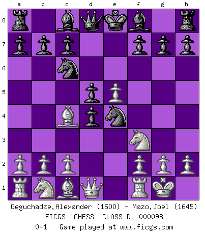 Last move : 0-1 2008 October 14 23:28:43 [Event "FICGS__CHESS__CLASS_D__000098"] [Site "FICGS"] [Date "2008.08.20"] [Round "1"] [White "Geguchadze,Alexander"] [Black "Mazo,Joel"] [Result "0-1"] [WhiteElo "1500"] [BlackElo "1645"] 1.e4 e5 2.d4 exd4 3.Nf3 Nc6 4.Bc4 Nf6 5.e5 Ne4 6.O-O d5 0-1 This chess game has been lost on time (started : 2008.08.20 20:29:13) Centre game Kingside Castling by player White (move 6) Player Black won this chess game. Follow this game move after move (download)Chess is above all, a fight ! (Emanuel Lasker) Bis zum Jahr 1971 verlief in meiner Schachkariere alles glatt. Dieses dramatische Match [Fischer-Taimanov 6:0] machte mein Leben zur Hölle. (Mark Taimanov) Hasta este punto, las blancas han seguido un análisis bien conocido. Pero ahora el hace un error fatal: empieza a usar su propia cabeza. (Siegbert Tarrasch) Votre seul travail dans les ouvertures est d'obtenir un milieu de partie jouable. (Lajos Portish) Macintosh - we might not get everything right, but at least we knew the century was going to end. (Douglas Adams)