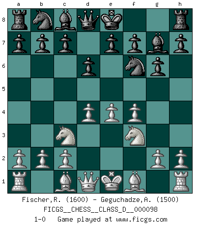 Last move : 1-0 2008 October 18 0:11:6 [Event "FICGS__CHESS__CLASS_D__000098"] [Site "FICGS"] [Date "2008.08.20"] [Round "1"] [White "Fischer,Richard"] [Black "Geguchadze,Alexander"] [Result "1-0"] [WhiteElo "1600"] [BlackElo "1500"] 1.e4 d6 2.d4 Nf6 3.Nc3 g6 4.f4 Bg7 5.Nf3 1-0 This chess game has been lost on time (started : 2008.08.20 20:29:13) Pirc : Austrian attack Player White won this chess game. Follow this game move after move (download)It is the aim of the modern school, not to treat every position according to one general law, but according to the principle inherent in the position. (Richard Reti) Korrekt heißt in Deutschland die Haltung eines Mannes, dessen Benehmen nach dem Urteile seiner Nachbarn seiner Stellung angemessen ist. Um korrekt zu sein, muß man sich der Meinung der anderen anpassen... (Emanuel Lasker) El Ajedrez detiene a su maestro dentro de sus propios vínculos, encadenando la mente y el cerebro, por lo que la libertad interior del mas fuerte debe sufrir. (Albert Einstein) La solitude du joueur d'Echecs à l'approche du mat est semblable à celle du condamné. (Francis Szpiner) In fact if nothing is done against this teddy bear, hereby I announce that I would quit chess, rapid chess, blitz chess, postal chess, email chess, server chess and correspondence chess I will then switch to a table game where teddy bears aren't going to be seen for a while, like Poker, or Roulette, all 18+ games. (Elmer Valderrama)