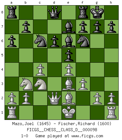 Last move : 1-0 2008 November 24 21:55:5 [Event "FICGS__CHESS__CLASS_D__000098"] [Site "FICGS"] [Date "2008.08.20"] [Round "1"] [White "Mazo,Joel"] [Black "Fischer,Richard"] [Result "1-0"] [WhiteElo "1645"] [BlackElo "1600"] 1.e4 c5 2.Nf3 Nc6 3.d4 cxd4 4.Nxd4 e5 5.Nb3 d6 6.c4 Nf6 7.Nc3 a6 8.Be2 Be6 9.Be3 Be7 10.Qd2 O-O 11.f3 1-0 This chess game has been lost on time (started : 2008.08.20 20:29:13) Sicilian : Labourdonnais-Loewenthal variation Kingside Castling by player Black (move 10) Player White won this chess game. Follow this game move after move (download)The mistakes are there, waiting to be made. (Savielly Tartakower) Kein Schachspieler kann gut schlafen. (H. G. Wells) La esencia del Ajedrez es pensar acerca de lo que el Ajedrez es. (David Bronstein) La tactique, c'est ce que vous faites quand il y a quelque chose à faire; la stratégie, c'est ce que vous faites quand il n'y a rien à faire. (Savielli Tartacower) A shortcut is the longest distance between two points. (Don Groves)
