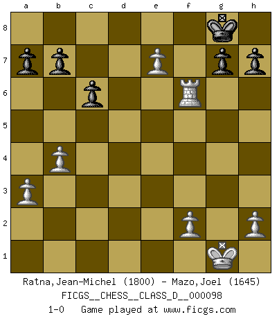 Last move : 1-0 2008 October 22 12:37:13 [Event "FICGS__CHESS__CLASS_D__000098"] [Site "FICGS"] [Date "2008.08.20"] [Round "1"] [White "Ratna,Jean-Michel"] [Black "Mazo,Joel"] [Result "1-0"] [WhiteElo "1800"] [BlackElo "1645"] 1.e4 e5 2.Nf3 Nf6 3.Nxe5 d6 4.Nf3 Nxe4 5.d4 d5 6.Bd3 Nc6 7.O-O Be7 8.c4 Nb4 9.Be2 Bf5 10.a3 Na6 11.Qb3 Rb8 12.cxd5 O-O 13.Ne5 Bd6 14.Qf3 Qf6 15.g4 Bg6 16.Qxf6 Nxf6 17.Nc3 Rfe8 18.Bb5 Red8 19.Bg5 Bxe5 20.dxe5 Nxg4 21.Bxd8 Rxd8 22.Rfe1 Nc5 23.e6 fxe6 24.dxe6 c6 25.Bc4 Re8 26.b4 Nd3 27.e7 Kh8 28.Bxd3 Bxd3 29.Rad1 Bg6 30.Rd8 Nf6 31.Ne4 Bxe4 32.Rxe4 Kg8 33.Rxe8+ Nxe8 34.Rf4 Nf6 35.Rxf6 1-0 Petrov : Classical attack Kingside Castling by player White (move 7) Kingside Castling by player Black (move 12) Player White won this chess game. Follow this game move after move (download)We cannot resist the fascination of sacrifice, since a passion for sacrifices is part of a Chessplayer's nature. (Rudolf Spielman) Das Schach hält seine Meister in eigenen Banden, Fesseln; auf vielerlei Weise formt es ihren Geist, so dass die innere Freiheit selbst des Stärksten beeinflusst wird. (Albert Einstein) Aquel que ve no otra dirección en el juego que la de dar Jaque Mate a su oponente, nunca será un buen jugador de Ajedrez. (Euwe) Les échecs sont un jeu par leur forme, un art par leur essence et une science par sa difficulté d'acquisition. Ils peuvent vous procurer autant de plaisir qu'un bon livre ou une belle musique, mais vous n'aurez une réelle joie que si vous arrivez à bien jouer. (Tigran Petrosian) Don't be discouraged. It's often the last key in the bunch that opens the lock. (Author unknown)