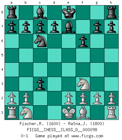 Last move : 0-1 2008 November 17 21:19:50 [Event "FICGS__CHESS__CLASS_D__000098"] [Site "FICGS"] [Date "2008.08.20"] [Round "1"] [White "Fischer,Richard"] [Black "Ratna,Jean-Michel"] [Result "0-1"] [WhiteElo "1600"] [BlackElo "1800"] 1.d4 Nf6 2.Bg5 Ne4 3.Nf3 Nxg5 4.Nxg5 e5 5.Qc1 exd4 6.Qf4 f6 7.Qe4+ Qe7 8.Qxe7+ Bxe7 9.Nf3 Nc6 10.c3 dxc3 0-1 This chess game has been lost on time (started : 2008.08.20 20:29:13) Trompowsky attack (Ruth, Opovcensky Opening) Player Black won this chess game. Follow this game move after move (download)Do you realize Fischer almost never has any bad pieces? He exchanges them, and the bad pieces remain with his opponents. (Yuri Balashov) Die Elozahlen sind sehr schlecht für das Schach. Jetzt ist Schach eine Sportindustrie, die darauf zielt Elopunkte zu machen. (Miguel Najdorf) Yo tuve un dolor de muelas en la primer partida. En el segundo juego, tuve un dolor de cabeza. En el tercero, tuve un ataque de reumatísmo. En la cuarta partida, no me sentía muy bien. ¿Y en el quinto juego? Bueno, ¿que acaso uno tiene que ganar todos los juegos?. (Siegbert Tarrasch) Les Cavaliers se révèlent fort utiles dans les positions fermées. D'habitude, les Fous sont un peu plus forts que les Cavaliers dans les positions ouvertes. Qu'on le veuille ou non, il restera toujours des exceptions ! Knowledge rests not upon truth alone, but upon error also. (Carl G. Jung)