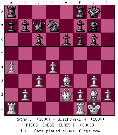 Last move : 1-0 2008 December 4 22:48:59 [Event "FICGS__CHESS__CLASS_D__000098"] [Site "FICGS"] [Date "2008.08.20"] [Round "1"] [White "Ratna,Jean-Michel"] [Black "Owsikowski,Andrzej"] [Result "1-0"] [WhiteElo "1800"] [BlackElo "1800"] 1.e4 c6 2.d4 d5 3.Nc3 dxe4 4.Nxe4 Nf6 5.Nxf6+ gxf6 6.c3 Bf5 7.Nf3 e6 8.g3 Nd7 9.Bg2 Bg7 10.O-O Qb6 11.Nh4 Bg6 12.Qe2 O-O 13.Nxg6 hxg6 14.Be3 Qc7 15.a4 1-0 Caro-Kann : Bronstein-Larsen variation Kingside Castling by player White (move 10) Kingside Castling by player Black (move 12) Player White won this chess game. Follow this game move after move (download)Chess makes man wiser and clear-sighted. (Vladimir Putin) Bobby Fischer ist kein Vorbild für die heutige Jugend. (Viktor Kortschnoi) Fischer no está bajo la obligación de nadie. (Joseph Platz) Si rien de grave n'est détecté lors de l'analyse d'une position, on joue alors le coup. Seconde règle de Blumenfeld. Even the best needles are not sharp at both ends. (Chinese proverb)