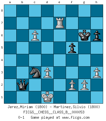 Last move : 0-1 2008 December 14 16:51:35 [Event "FICGS__CHESS__CLASS_B__000053"] [Site "FICGS"] [Date "2008.08.21"] [Round "1"] [White "Jerez,Miriam"] [Black "Martinez,Silvio"] [Result "0-1"] [WhiteElo "1800"] [BlackElo "1800"] 1.e4 e5 2.Nf3 Nc6 3.Nc3 d5 4.exd5 Nce7 5.Nxe5 Nh6 6.Bb5+ c6 7.dxc6 bxc6 8.Bxc6+ Bd7 9.O-O Bxc6 10.Nxc6 Nxc6 11.Re1+ Be7 12.d3 O-O 13.Bxh6 gxh6 14.b3 Bf6 15.h3 Bxc3 16.Qg4+ Kh8 17.Qe4 Bxa1 18.Rxa1 Qf6 19.Re1 Rfe8 20.Qxe8+ Rxe8 21.Rxe8+ Kg7 22.c4 Nd4 23.c5 Nf5 24.a4 Nd4 25.b4 Qc6 26.Re4 Nb3 27.a5 f5 28.Re7+ Kf6 29.Rxh7 Kg6 30.Rxa7 Kf6 31.a6 Nd4 32.Kf1 Nb5 33.Rh7 Kg6 34.Re7 Qxa6 35.Ke1 Qa1 36.Ke2 Qb2+ 37.Ke3 Qd4+ 38.Ke2 Qxb4 39.c6 Qb2 40.Kd1 Nc3+ 0-1 Three knights game Kingside Castling by player White (move 9) Kingside Castling by player Black (move 12) Player Black won this chess game. Follow this game move after move (download)If you aren't afraid of Spassky, then I have removed the element of money. (Jim Slater) Wenn ich gewinne bin ich ein Genie. Wenn nicht, dann bin ich keines. (Robert James Fischer) Siempre es mucho mejor sacrificar las piezas de tu oponente. (Savielly Tartakover) La vérité est comme le meilleur coup aux échecs : elle existe, mais il faut la chercher. (Arturo Perez-Reverte) Creativity is allowing yourself to make mistakes. Art is knowing which ones to keep. (Scott Adams)