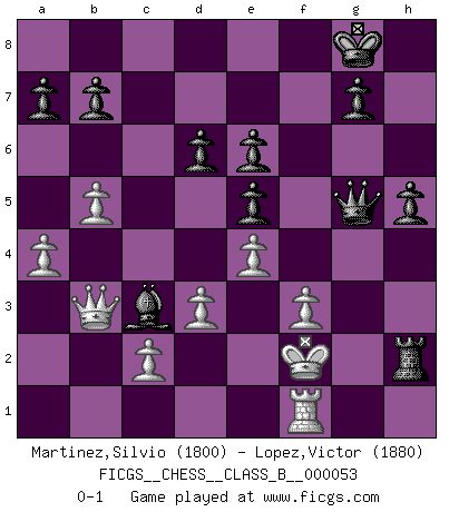 Last move : 0-1 2008 December 14 17:14:44 [Event "FICGS__CHESS__CLASS_B__000053"] [Site "FICGS"] [Date "2008.08.21"] [Round "1"] [White "Martinez,Silvio"] [Black "Lopez,Victor"] [Result "0-1"] [WhiteElo "1800"] [BlackElo "1880"] 1.e4 e5 2.Nf3 Nc6 3.Bc4 Bc5 4.Nc3 Nf6 5.O-O O-O 6.d3 d6 7.a3 Be6 8.Bxe6 fxe6 9.b4 Bb6 10.Bg5 Nd4 11.a4 Qe8 12.Nxd4 Bxd4 13.Nb5 Bxa1 14.Nxc7 Qc8 15.Nxa8 Bc3 16.b5 Qxa8 17.h4 h6 18.Bxf6 Rxf6 19.g4 Qd8 20.f3 h5 21.g5 Rf4 22.Qb1 Rxh4 23.Qb3 Qxg5+ 24.Kf2 Rh2+ 0-1 Giuoco Piano : Four knights variation Kingside Castling by player White (move 5) Kingside Castling by player Black (move 5) Player Black won this chess game. Follow this game move after move (download)Chess problems demand from the composer the same virtues that characterize all worthwhile art: originality, invention, conciseness, harmony, complexity, and splendid insincerity. (Vladimir Nabokov) Der Partner hat auch seine Existenzberechtigung. (Savielly Grigorievitsch Tartakower) En partidas rápidas, el Caballo es mas poderoso que el Alfil. (Vlastimil Hort) Votre seul travail dans les ouvertures est d'obtenir un milieu de partie jouable. (Lajos Portish) An expert is a man who has made all the mistakes which can be made in a very narrow field. (Niels Bohr)