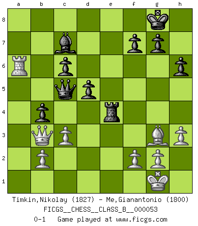 Last move : 0-1 2008 December 18 13:3:39 [Event "FICGS__CHESS__CLASS_B__000053"] [Site "FICGS"] [Date "2008.08.21"] [Round "1"] [White "Timkin,Nikolay"] [Black "Me,Gianantonio"] [Result "0-1"] [WhiteElo "1827"] [BlackElo "1800"] 1.e4 e5 2.Nf3 Nc6 3.Bb5 a6 4.Ba4 Nf6 5.O-O b5 6.Bb3 Bc5 7.c3 d6 8.h3 Bb7 9.d4 Bb6 10.Re1 O-O 11.Bg5 h6 12.Bh4 Re8 13.dxe5 Nxe5 14.Nxe5 Rxe5 15.Nd2 Qe7 16.Bc2 Re8 17.a4 Re6 18.axb5 axb5 19.Bd3 b4 20.Bb5 c6 21.Bc4 d5 22.Ba6 Bxa6 23.Rxa6 Qc5 24.Qb3 Nxe4 25.Nxe4 Rxe4 26.Rxe4 Rxe4 27.Bg3 Bc7 0-1 Ruy Lopez : 5.O-O Kingside Castling by player White (move 5) Kingside Castling by player Black (move 10) Player Black won this chess game. Follow this game move after move (download)He who fears an isolated Queen's Pawn should give up Chess. (Siegbert Tarrasch) Als er Schachweltmeister wurde ließ er praktisch alle stärksten Sovietspieler für sich arbeiten. Wenn ein auch nur mittelmässiger Meister ein Spezialist für eine bestimmte Eröffnung war, wurde er von Karpov gerufen. Das wurde alles geheim gehalten. (Mikhail Moiseyevich Botvinik) Cuando tu casa esta en llamas, no puedes ser molestado por tus vecinos. O, como decinos en Ajedrez, si tu Rey esta bajo ataque, no te preocupa perder un Peón del lado de la Reina. (Gary Kasparov) Des idées, des idées, j'en ai cent, j'en ai mille. Des bonnes, des mauvaises, applicables, irréalisables... Il suffit de faire le tri ! (Roos) A mistake is only a mistake if you let it happen twice. Otherwise it is a learning experience. (Daniel Parmet)